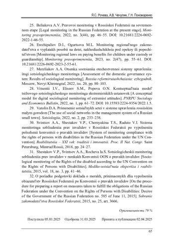 25. Белякова, А.В. Правовой мониторинг в Российской Федерации на современном этапе / А.В. Белякова // Мониторинг правоприменения. - 2022. - № 3(44). - С. 46-55. DOI: 10.21681/2226-0692-2022-1-46-55 EDN: RXYNCT