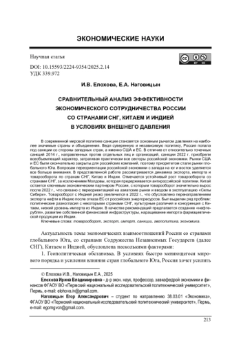 Актуальность темы экономических взаимоотношений России со странами глобального Юга, со странами Содружества Независимых Государств (далее СНГ), Китаем и Индией, обусловлена несколькими факторами: