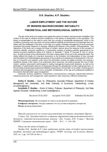 Проведен анализ и дана оценка характера современной макроэкономической нестабильности в контексте необходимости достижения динамического равновесия в сфере трудовой занятости населения. Обосновывается тезис о необходимости перехода от концепции устойчивого развития, которая в условиях растущей социально-экономической и общественно-политической нестабильности и турбулентности все меньше соответствует вызовам времени, к идее быстро реагирующей на изменения системе гибкого управления социально-экономическими процессами, отражающей особенности современной «антропосферы». Задачами исследования являются оценка представлений современной науки о сущности понятий экономической стабильности, экономического равновесия, компаративный анализ существующих научных подходов к оценке экономического равновесия (идей Ж. Дебре, А. Маршалла, Т. Модиса, Р. Курцвейла, Р. Сури, К. Эрроу и др.), а также вопросов его достижения на рынке труда (рабочей силы) и на самом предприятии. В статье отражены результаты многолетней дискуссии в вопросах формирования и обсуждения новых концепций и теоретико-методологических подходов к анализу и оценке трудовой занятости в условиях долгосрочного и системного кризиса. Поскольку в условиях информационного общества и цифровой революции происходит качественное изменение характера трудовых ресурсов предприятия, в статье предложено использование многовариантных, вариативных, полиморфных технологий в принятии управленческих (кадровых) решений, а также устранение оппортунистического поведения работников посредством развития трудового самоуправления, на принципах гарантированной занятости (пожизненного найма), формирования так называемых «рабочих групп» (креативное самоуправление) и более последовательного учета возрастных и профессиональных качеств самих работников при оплате их труда.