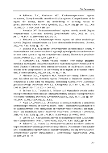 10. Субботина, Т.Н. Конкурентоспособность региона: сущность, факторы и методика оценки российских регионов / Т.Н. Субботина, М.Д. Харламов // Экономика и бизнес: теория и практика. - 2023. - № 9(103). - С. 188-193. DOI: 10.24412/2411-0450-2023-9-188-193 EDN: CLIJSL