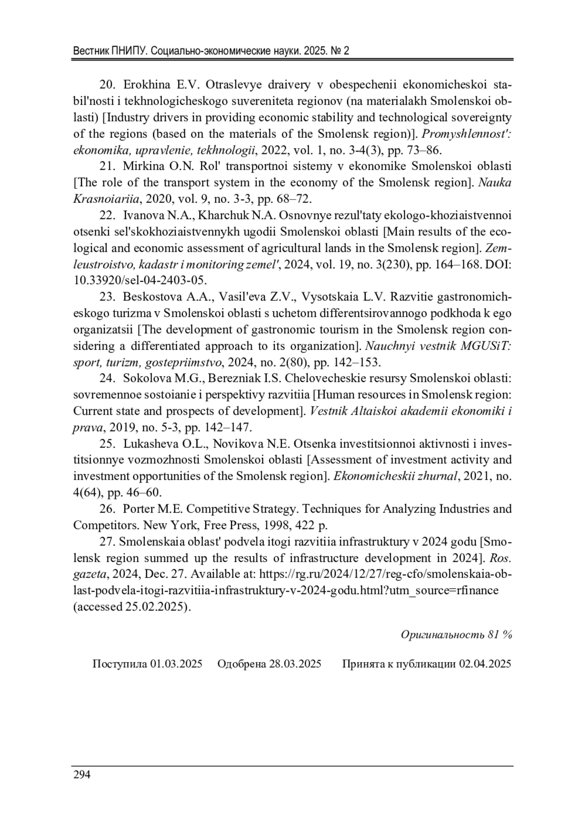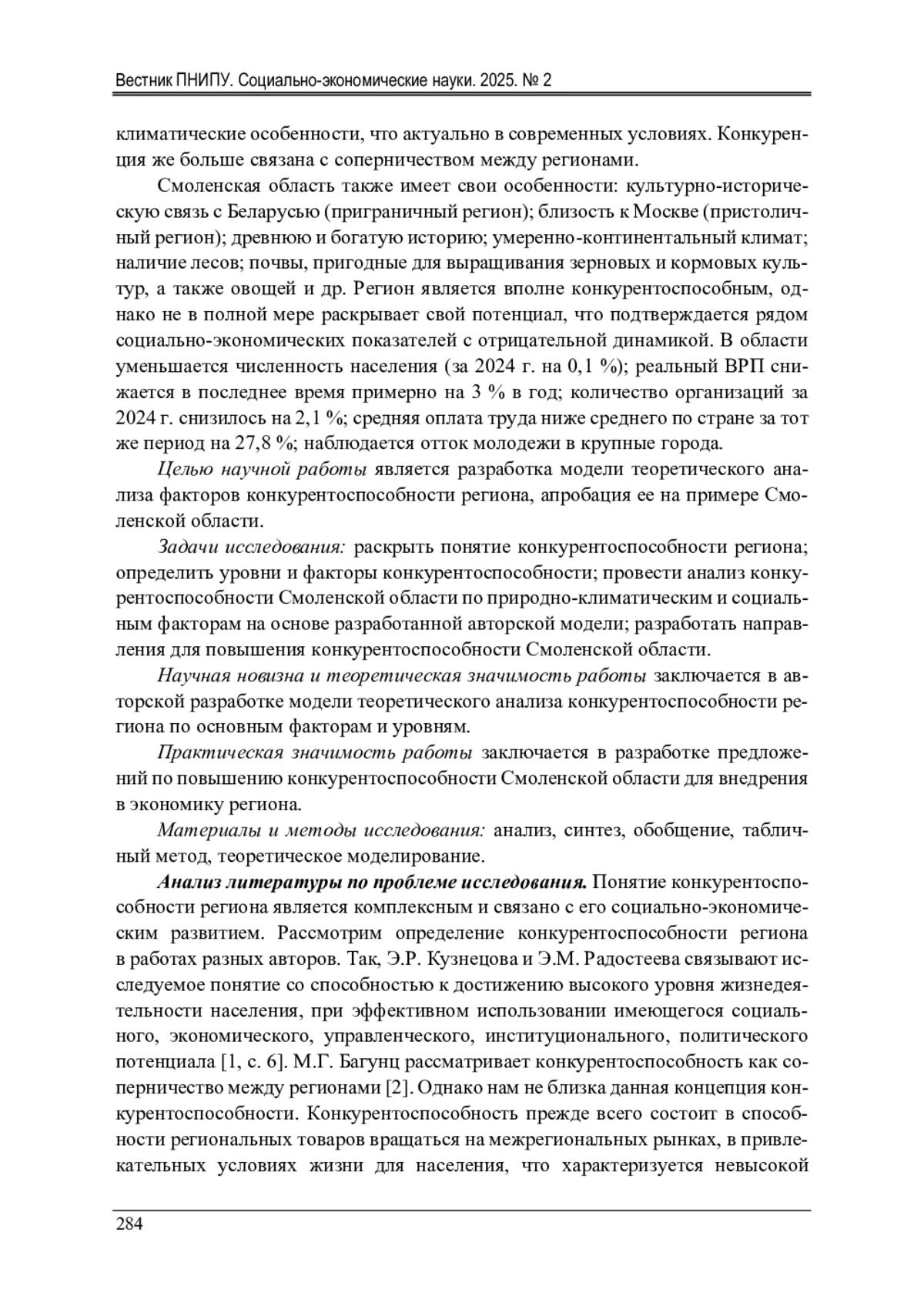 1. Кузнецова, Э.Р. Сущность и экономическое содержание понятия “конкурентоспособность региона” / Э.Р. Кузнецова, Э.М. Радостева // Интернет-журнал “Науковедение”. - 2015. - Т. 7, № 5. - URL: http://naukovedenie.ru/PDF/60EVN515.pdf (дата обращения: 19.02.2025). DOI: 10.15862/60EVN515 EDN: VJKPQD