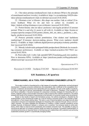 Современный рынок характеризуется высокой степенью конкуренции, глобализацией и высоким уровнем развития технологий. Изменение потребительских предпочтений и ожиданий также вносит свой вклад в конкурентную среду. Клиенты становятся более требовательными и обращают внимание не только на качество продукции, но и высокий уровень обслуживания, персонализацию и удобство взаимодействия. Поэтому в условиях такой жесткой конкуренции компаниям стало необходимо развивать стратегии взаимодействия с клиентами, интегрировать различные каналы коммуникаций с целью улучшения клиентского опыта. В статье представлены результаты анализа подходов к формированию потребительской лояльности с помощью омниканальности. На основе результатов экспертного и формализованного опросов авторами был разработан чек-лист по внедрению системы омниканальности как инструмента формирования потребительской лояльности в деятельность пермского магазина одежды «Raklanova Brand». Данный инструмент представляет собой набор рекомендаций и шагов, которые позволят компаниям структурировать и реализовать стратегии взаимодействия с клиентами через различные каналы связи. Работа подчеркивает важность создания единого клиентского опыта через различные каналы взаимодействия компании с клиентом, от физических магазинов до онлайн-платформ, что способствует улучшению узнаваемости бренда и повышению уровня доверия со стороны потребителей. Анализируются преимущества использования омниканального подхода для повышения лояльности клиентов и увеличения объемов продаж. Успешная реализация омниканальности становится важным фактором для формирования долгосрочных отношений с клиентами и достижения устойчивого роста бизнеса в условиях динамично меняющегося рынка. Результаты работы служат ценным ресурсом для компаний, которые стремятся адаптироваться к новым условиям рынка и повысить свою конкурентоспособность.