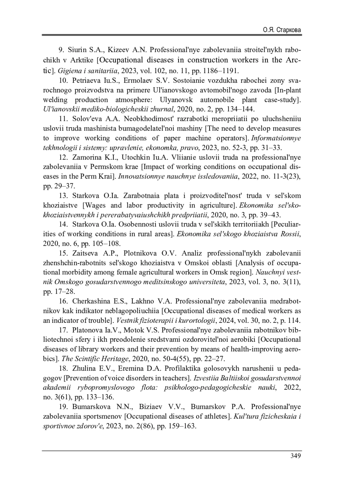 14. Старкова, О.Я. Особенности условий труда в сельских территориях / О.Я. Старкова // Экономика сельского хозяйства России. - 2020. - № 6. - С. 105-108. EDN: KJXMXC