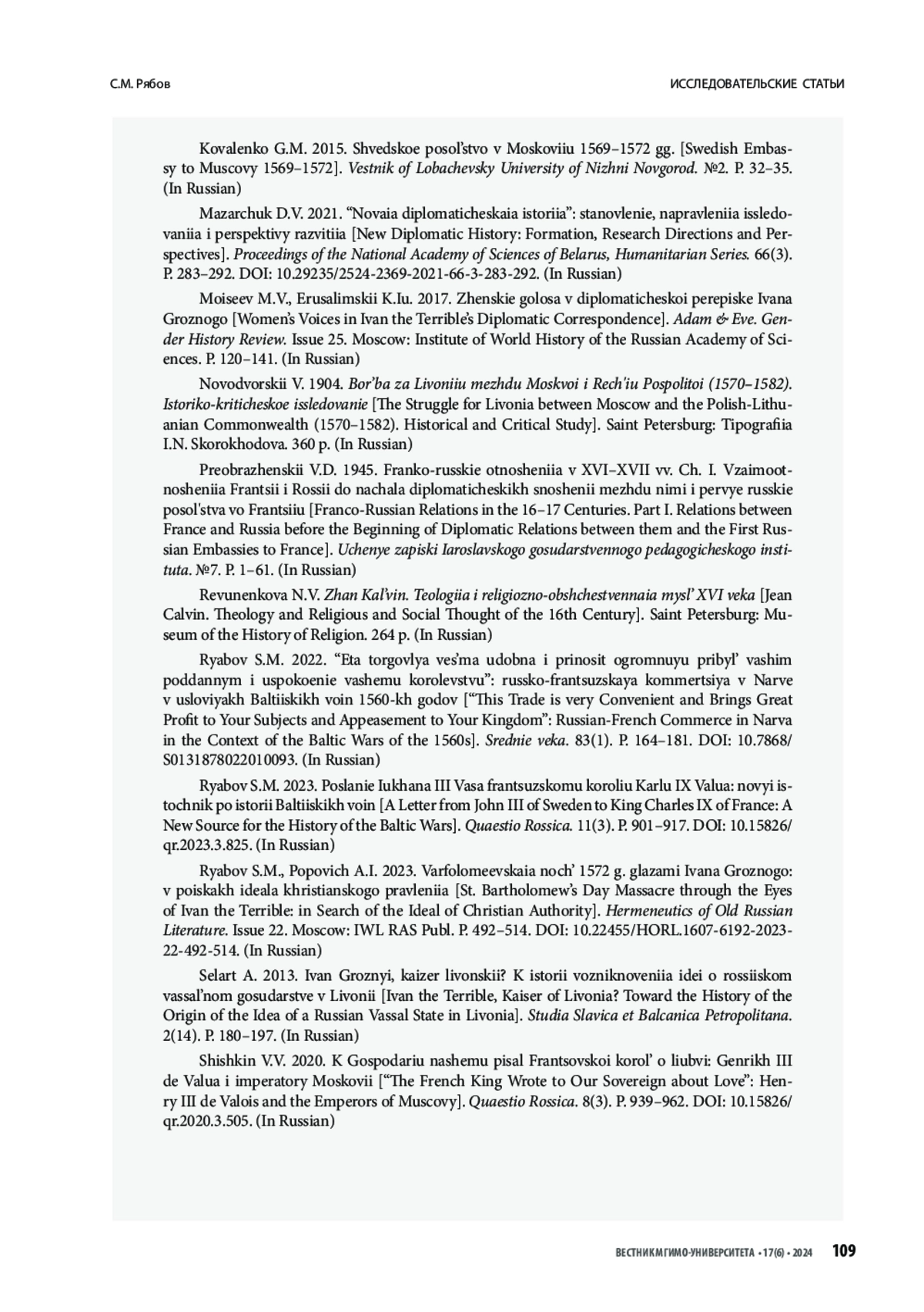 43. Рябов С.М. 2023. Послание Юхана III Васа французскому королю Карлу IX Валуа: новый источник по истории Балтийских войн. Quaestio Rossica. 11(3). С. 901-917.