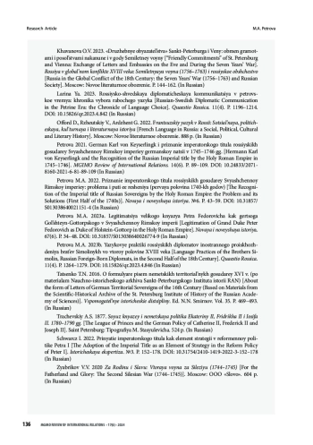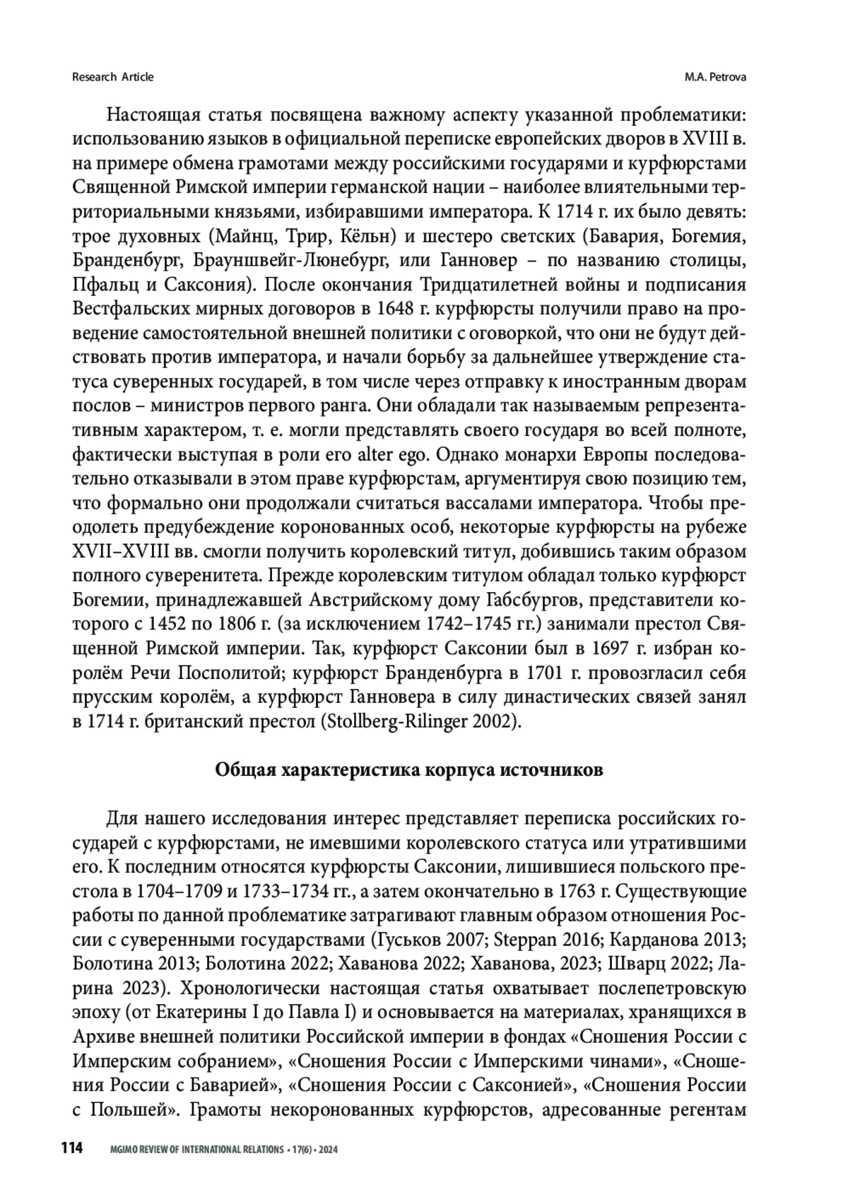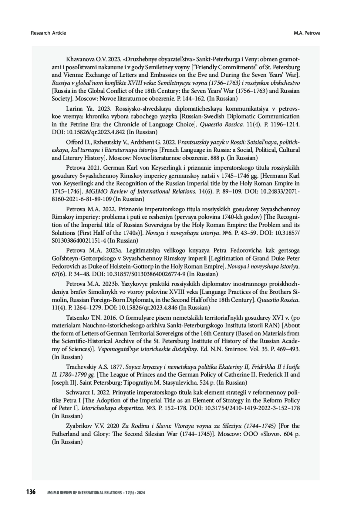 ПЕТРОВА М. А. ЯЗЫКИ ПИСЬМЕННОГО И УСТНОГО ОБЩЕНИЯ РОССИЙСКИХ ИМПЕРАТОРОВ И КУРФЮРСТОВ СВЯЩЕННОЙ РИМСКОЙ ИМПЕРИИ В 1725–1799 ГГ. // ВЕСТНИК МГИМО-УНИВЕРСИТЕТА. 2024. ТОМ 17, № 6