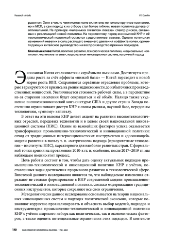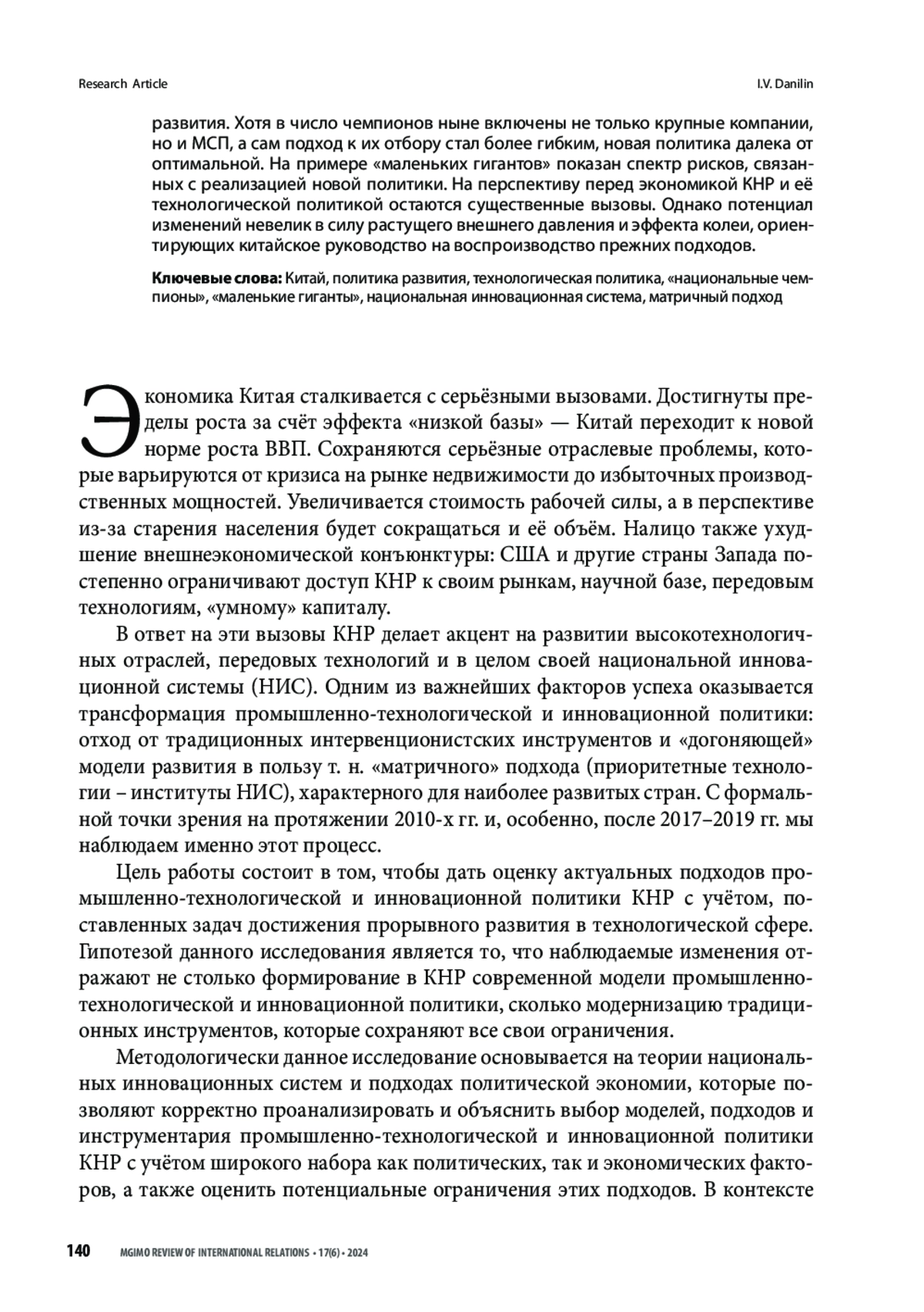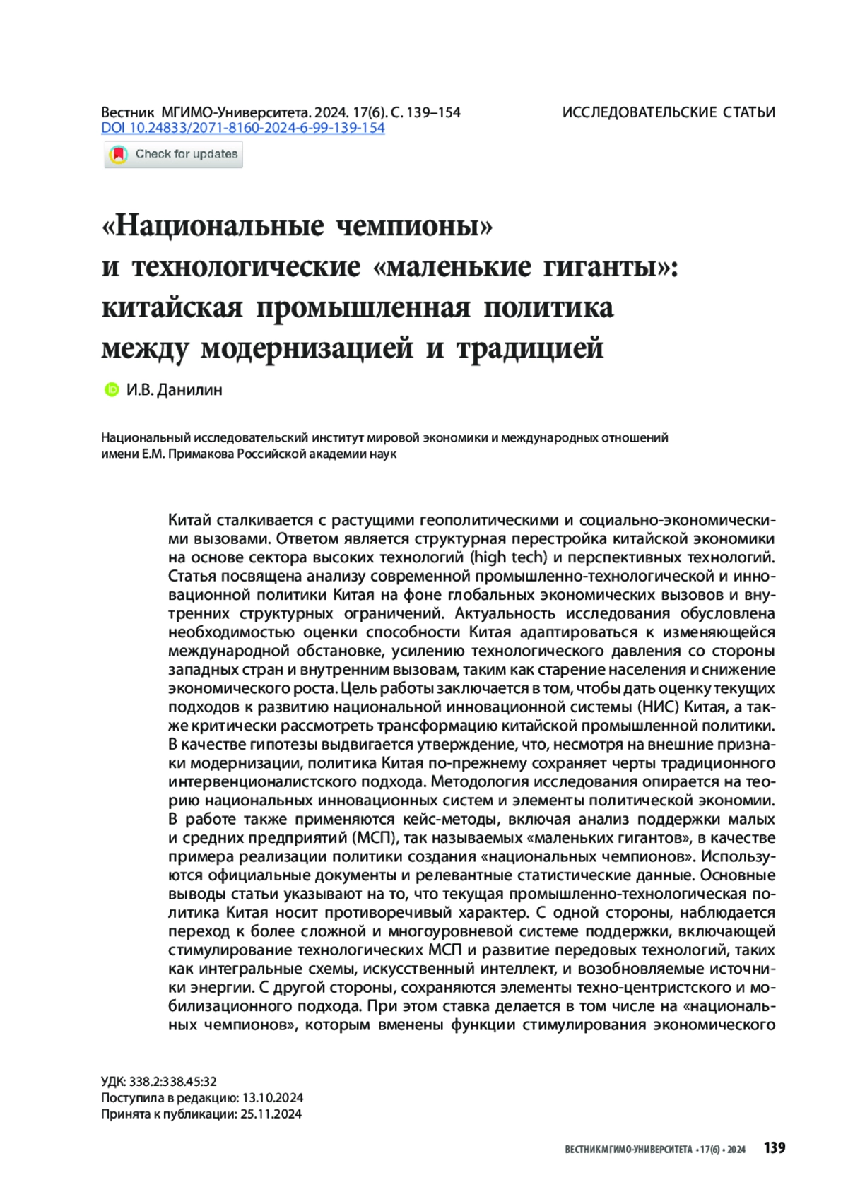 ДАНИЛИН И. В. «НАЦИОНАЛЬНЫЕ ЧЕМПИОНЫ» И ТЕХНОЛОГИЧЕСКИЕ «МАЛЕНЬКИЕ ГИГАНТЫ»: КИТАЙСКАЯ ПРОМЫШЛЕННАЯ ПОЛИТИКА МЕЖДУ МОДЕРНИЗАЦИЕЙ И ТРАДИЦИЕЙ // ВЕСТНИК МГИМО-УНИВЕРСИТЕТА. 2024. ТОМ 17, № 6