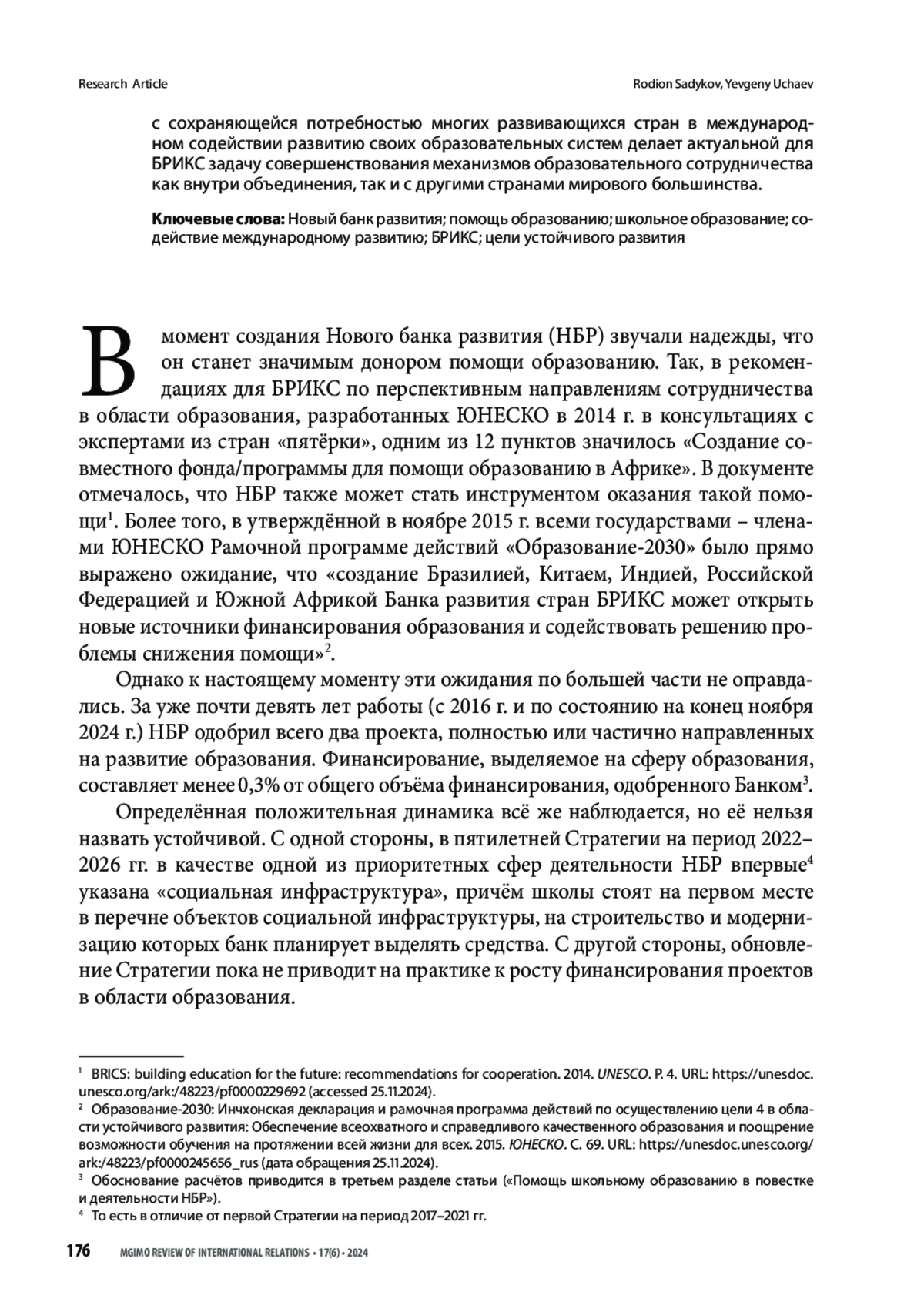 7. Dmitrieva V.A., Kuznetsov D.A. 2024. The Role of the IBSA Fund in Foreign Aid Policies of IBSA and BRICS Member States. MGIMO Review of International Relations. 17(1). P. 113-134. https://doi.org/10.24833/2071-8160-2024-1-94-113-134.
