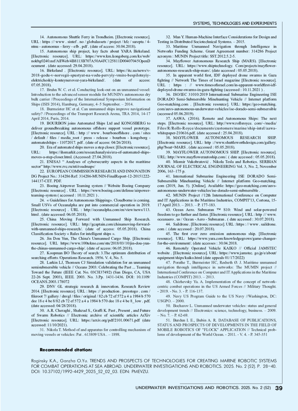 РОГИНСКИЙ К. А., ГАНЖА О. Ю. ТЕНДЕНЦИИ И ПЕРСПЕКТИВЫ ТЕХНОЛОГИЙ СОЗДАНИЯ МОРСКИХ РОБОТОТЕХНИЧЕСКИХ СИСТЕМ ДЛЯ ВЕДЕНИЯ ОПЕРАЦИЙ И БОЕВЫХ ДЕЙСТВИЙ НА МОРЕ ЗА РУБЕЖОМ // ПОДВОДНЫЕ ИССЛЕДОВАНИЯ И РОБОТОТЕХНИКА. 2025. № 2 (52)