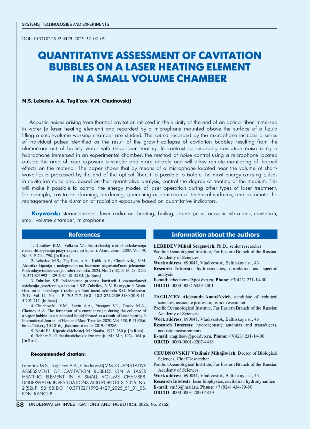 8. Lebedev M.S., Tagil’cev A.A., Kulik A.V., Chudnovskij V.M. Akustika kipenija s nedogrevom na lazernom nagrevatel’nom jelemente. Podvodnye issledovanija i robototehnika. 2024. No. 2 (48). P. 16-28. [In Russ]. DOI: 10.37102/1992-4429-2024-48-02-03