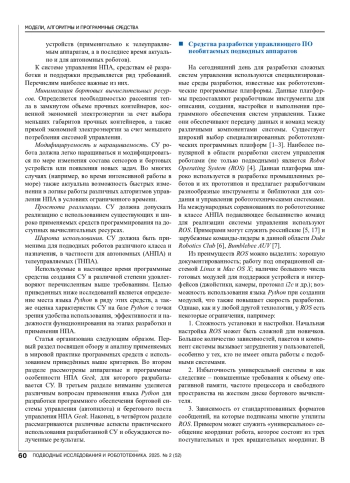 Необитаемые подводные аппараты (НПА) как телеуправляемого, так и автономного класса играют ключевую роль в исследовании и освоении глубин Мирового океана. Создание программного обеспечения (ПО) подводных аппаратов-роботов требует применения современных технологий и программных решений. В свою очередь, системы управления НПА имеют особенности, отличающие их от соответствующих систем наземных и воздушных мобильных роботов. Данные различия обусловлены нестабильной и медленной связью подводного аппарата с оператором или ее полным отсутствием (в случае автономных подводных аппаратов), менее точной и/или редко обновляемой навигацией, ограниченным числом датчиков внешней среды, а также необходимостью оперативного принятия решений в различных нештатных ситуациях, происходящих в процессе выполнения поставленных задач.