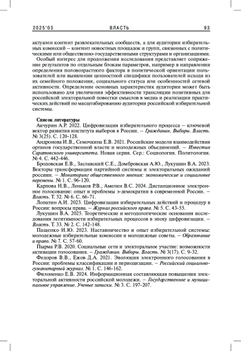 1. Акчурин А.Р. 2022. Цифровизация избирательного процесса - ключевой вектор развития института выборов в России. - Гражданин. Выборы. Власть. № 3(25). С. 120-128. EDN: UVLLHN