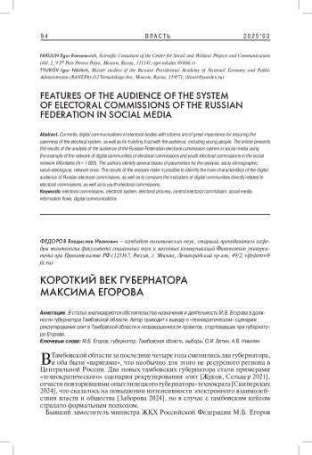 В статье анализируются обстоятельства назначения и деятельность М. Б. Егорова в должности губернатора Тамбовской области. Автор приходит к выводу о «технократическом» сценарии рекрутирования элит в Тамбовской области и незавершенности проектов, стартовавших при губернаторе Егорове.