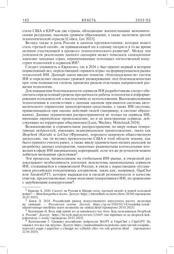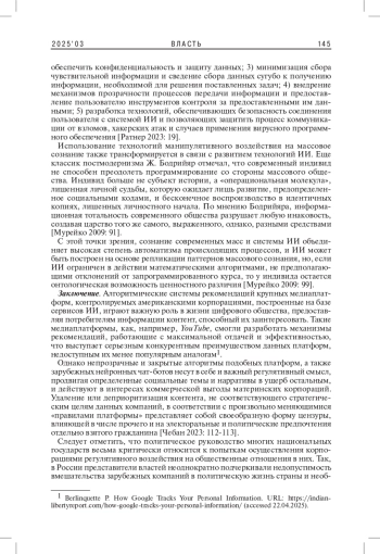 1. Володенков С.В., Федорченко С.Н., Печенкин Н.М. 2024. Риски, угрозы и вызовы внедрения искусственного интеллекта и нейросетевых алгоритмов в современную систему социально-политических коммуникаций: по материалам экспертного исследования. - Вестник Российского университета дружбы народов. Сер. Политология. Т. 26. № 2. С. 406-424. EDN: LWSYCV