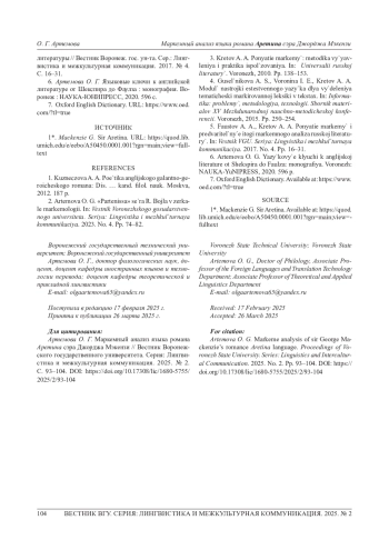 5. Фаустов А. А., Кретов А. А. Понятие маркемы и предварительные итоги маркемного анализа русской литературы // Вестник Воронеж. гос. ун-та. Сер.: Лингвистика и межкультурная коммуникация. 2017. № 4. С. 16-31.