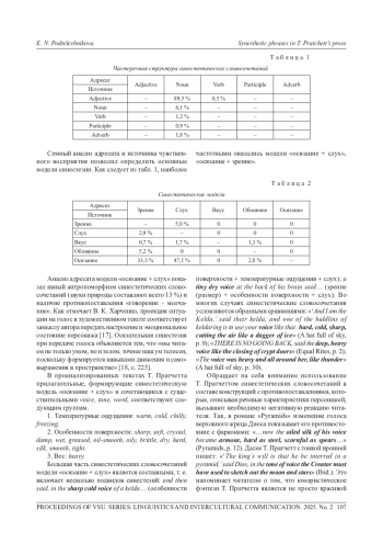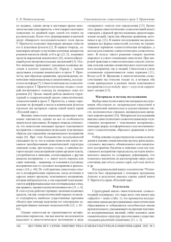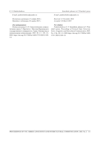 В статье описаны результаты анализа синестетических словосочетаний в книгах Т. Пратчетта серии «Плоский мир». Под синестетическими мы понимаем словосочетания, в которых оба слова принадлежат к разным типам чувственного восприятия и не затрагивают эмоции. Структурно синестезия реализуется в форме метафоры, метонимии, а также может совпадать с формой других языковых средств выражения эмоций, таких как образные сравнения, антонимы и т. д. Чаще всего в прозе Т. Пратчетта синестетические словосочетания имеют вид «adjective + noun». Семный анализ структуры значения адресата и источника чувственного восприятия позволил определить наиболее частотные модели «осязание + слух» и «осязание + зрение». Был выявлен явный антропоморфизм синестетических словосочетаний «осязание + слух», а также определена их составная структура, включающая несколько подвидов синестезий и конструкции с противопоставлениями. Значимым для Т. Пратчетта является молчание, которое предстает неким рубежом между жизнью и смертью, что также подчеркивается наличием противопоставление «свет - тьма» в модели «осязание + зрение». К основным функциям синестетических словосочетаний в прозе Т. Пратчетта были отнесены эстетическая функция эмоционально-экспрессивного воздействия, а также функция создания комического, особенно в составе сложных конструкций с олицетворениями, образными сравнениями, антитезой и парадоксом.