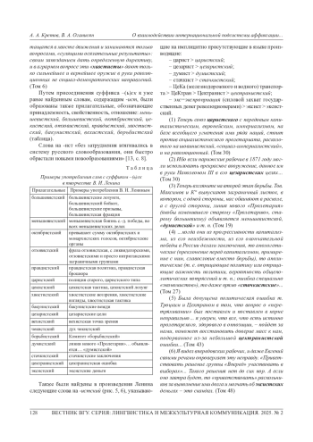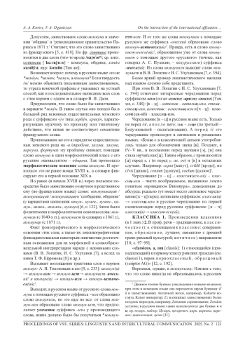 В русском языке встречаются не только заимствованные лексические единицы (иноязычные слова), но также и отвлекаемые от них интернациональные морфемы (аффиксы), участвующие в словообразовании. Есть два этапа, которые могут проходить заимствованные слова: фонографическое и морфологическое освоения. Первое происходит при звуковом или визуальном восприятии лексической единицы. При втором же этапе ей приписываются уже некие грамматические характеристики, свойственные языку, в который слово было заимствовано. Также поднимается проблема нечленимости заимствованных основ и как они становятся частью русской словообразовательной системы в статусе радикса. Система аффиксации русского языка состоит из нескольких взаимодействующих друг с другом подсистем, среди которых есть исконная и интернациональная подсистемы, элементы которых будут рассмотрены в этой статье. Авторы ставят перед собой цель описать совместную работу этих двух подсистем. Наибольший интерес вызывают дериваты от русских корней с использованием интернациональных суффиксов -ист, -изм, составляющие предмет исследования. Объектом исследования являются пятьдесят пять томов «Полного собрания сочинений» В. И. Ленина общим объемом в 4 504 182 словоупотребления. После проведения лемматизации (приведения слов к их начальной форме) всех анализируемых текстов, порожденных конкретной личностью, и получения частотного словаря языка В. И. Ленина из него были извлечены необходимые лексические единицы, которые содержали интернациональные суффиксы - ист и - изм (имеющие греко-латинское происхождение), а также русские корни. Таким образом, были получены результаты частотности употребления языковых единицы различных частей речи (имена существительные и прилагательные). Результаты были представлены в виде графической визуализации.
