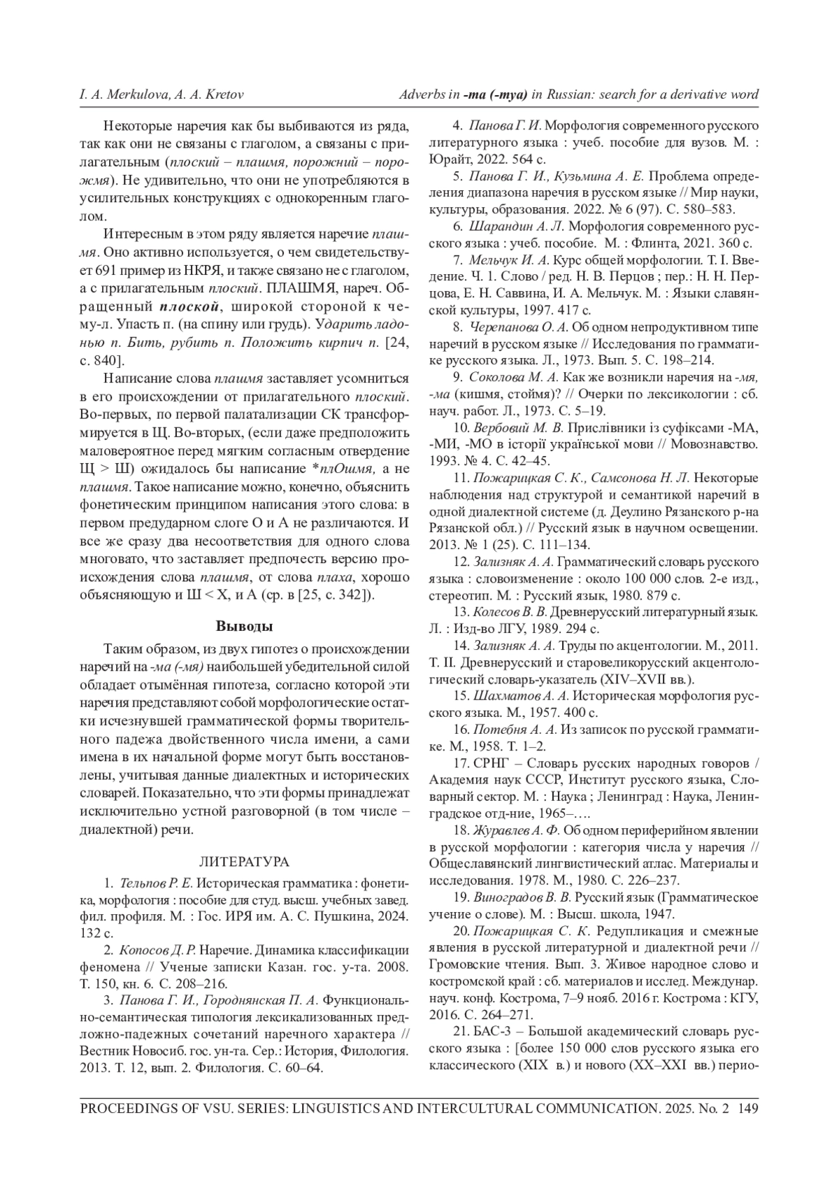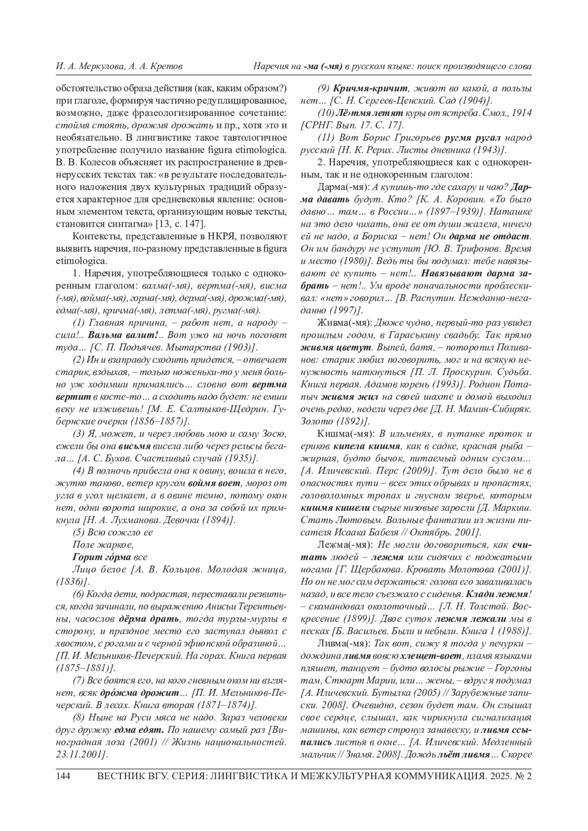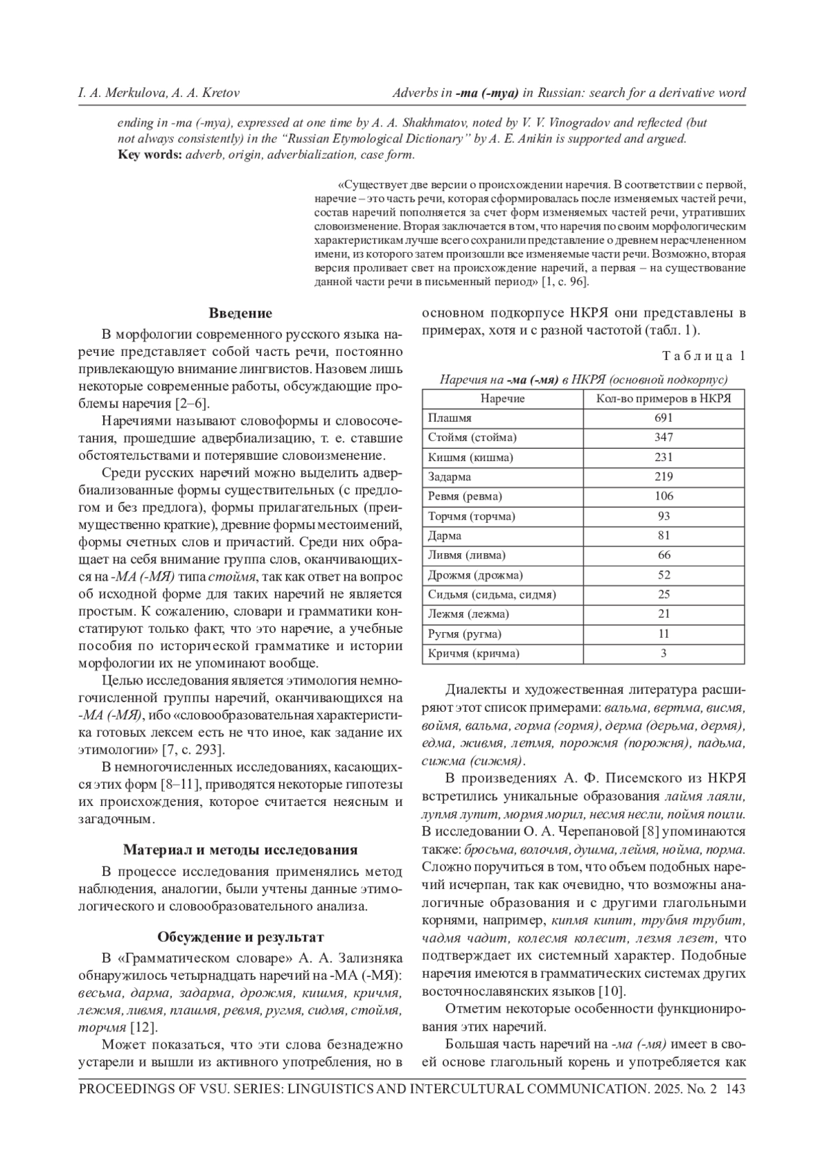 МЕРКУЛОВА И. А., КРЕТОВ А. А. НАРЕЧИЯ НА -МА (-МЯ) В РУССКОМ ЯЗЫКЕ: ПОИСК ПРОИЗВОДЯЩЕГО СЛОВА // ВЕСТНИК ВОРОНЕЖСКОГО ГОСУДАРСТВЕННОГО УНИВЕРСИТЕТА. СЕРИЯ: ЛИНГВИСТИКА И МЕЖКУЛЬТУРНАЯ КОММУНИКАЦИЯ. 2025. № 2