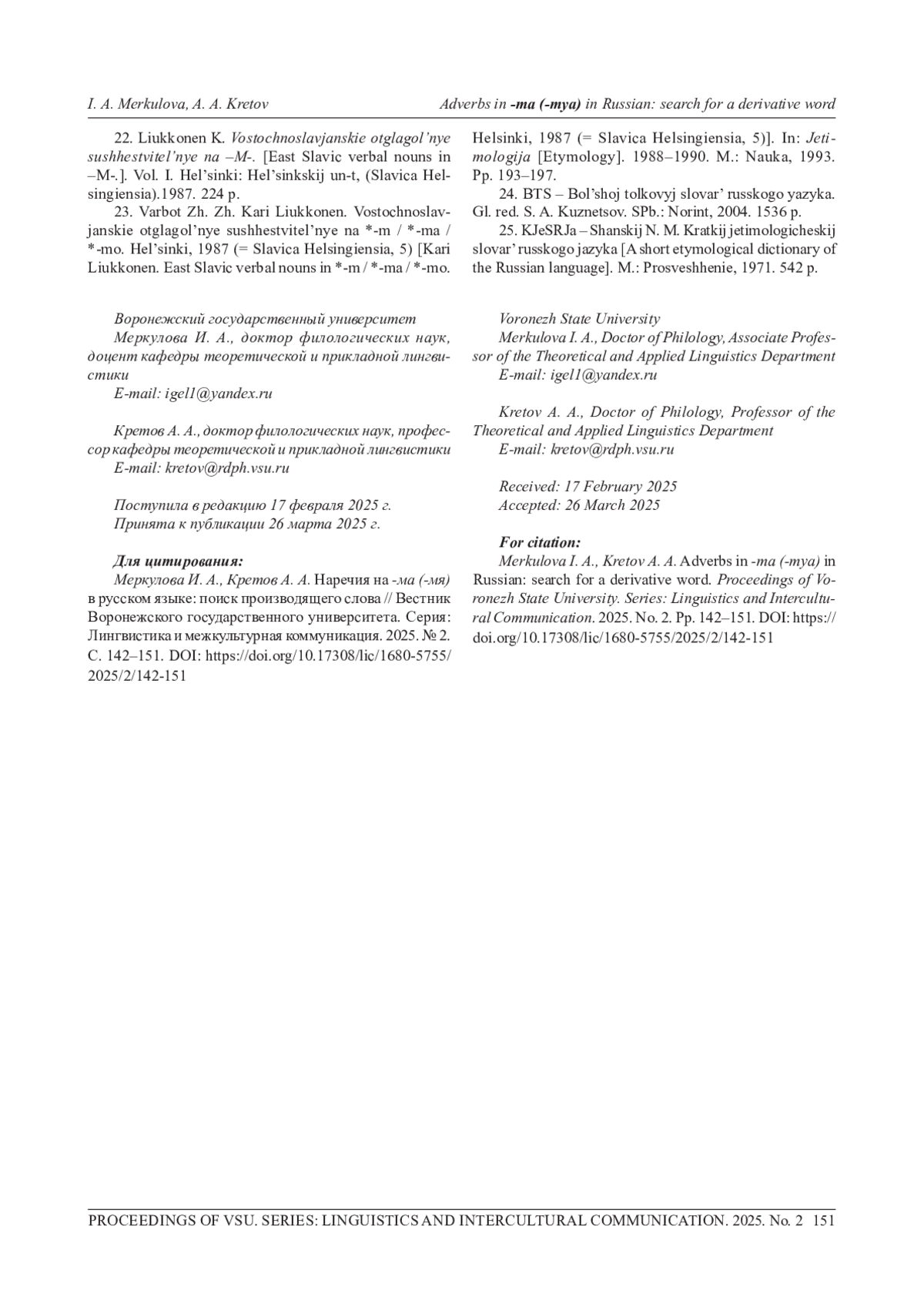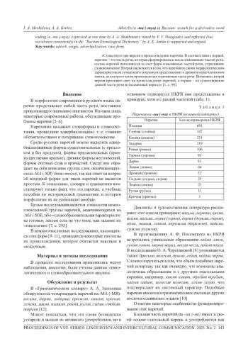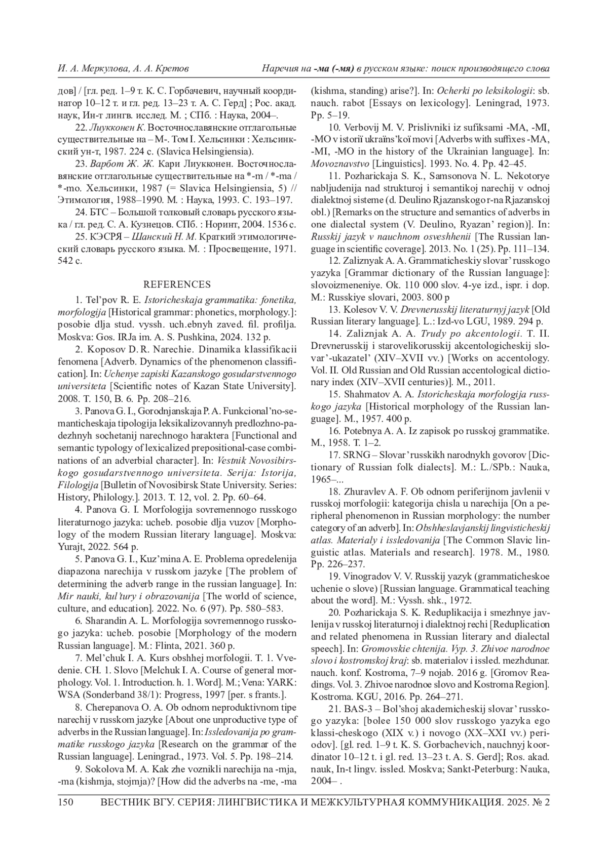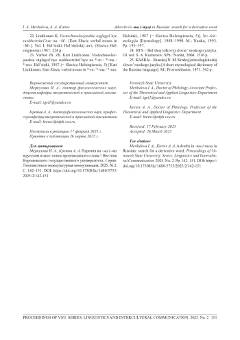 МЕРКУЛОВА И. А., КРЕТОВ А. А. НАРЕЧИЯ НА -МА (-МЯ) В РУССКОМ ЯЗЫКЕ: ПОИСК ПРОИЗВОДЯЩЕГО СЛОВА // ВЕСТНИК ВОРОНЕЖСКОГО ГОСУДАРСТВЕННОГО УНИВЕРСИТЕТА. СЕРИЯ: ЛИНГВИСТИКА И МЕЖКУЛЬТУРНАЯ КОММУНИКАЦИЯ. 2025. № 2