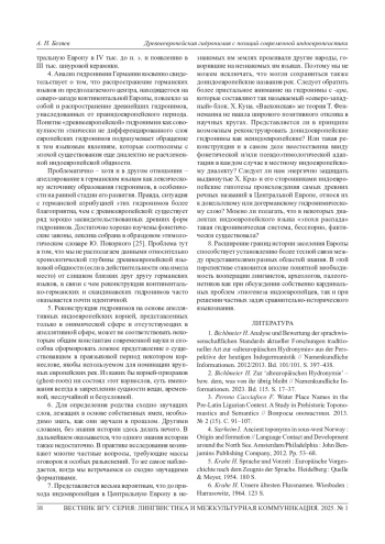 1. Bichlmeier Н. Analyse und Bewertung der sprachwissenschaftlichen Standards aktueller Forschungen traditioneller Art zur “alteuropaischen Hydronymie” aus der Perspektive der heutigen Indogermanistik // Namenkundliche Informationen. 2012/2013. Bd. 101/101. S. 397-438.