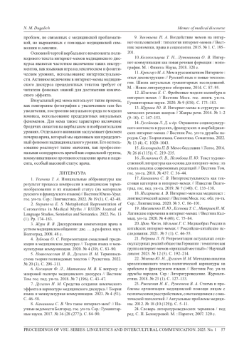 2. Stepanova Е. S. Metaphorical Representation of Coronavirus in Medical Myths // RUDN Journal of Language Studies, Semiotics and Semantics. 2022. No. 13 (1). Рр. 174-183. EDN: XOETEB