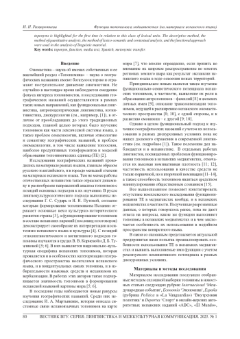 Статья посвящена анализу функций топонимов в испанских медиатекстах. В ней приведены результаты исследования, целью которого было выявить функции, реализуемые топонимами в зависимости от их использования как средства первичной номинации для референции к традиционному реальному денотату (географическому объекту) или как средства вторичной номинации (применительно к единичному или коллективному субъекту на основе метонимических или метафорических переносов). Анализ функционирования топонимов в новостных публикациях из четырех рубрик выявил высокую топонимическую насыщенность испанских медиатекстов. Наиболее частотные классы топонимов демонстрируют более высокий номинативный потенциал и максимальное количество переносов, универсальной является метонимическая формула: «место - жители». Были выделены основные и дополнительные функции топонимов в медиатекстах. К основным функциям относятся адресная или идентифицирующая: при употреблении топонима в прямом значении и в зависимости от формы представления в тексте (самостоятельно, в составе апеллятивно-топотнимического комплекса или с конкретизаторами) реализуется или одна, или другая функция. При употреблении топонима в переносном значении также реализуется идентифицирующая функция. К дополнительным функциям относятся аттрактивная, идеологическая, функция переключения параметров хронотопа, оценочно-характеризующая, текстоорганизующая. Идеологическая функция получает новую трактовку. Текстоорганизующая функция топонимов выделяется впервые применительно к данному классу лексических единиц. При анализе языкового материала применялись описательный метод, метод количественного анализа, метод лексикосемантического и контекстуального анализа, функциональный подход.