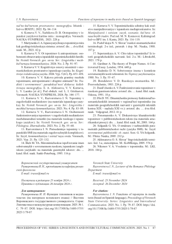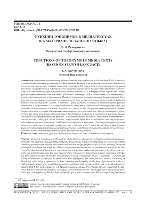 РАЗВОРОТНЕВА И.Н. ФУНКЦИИ ТОПОНИМОВ В МЕДИАТЕКСТАХ (НА МАТЕРИАЛЕ ИСПАНСКОГО ЯЗЫКА) // ВЕСТНИК ВОРОНЕЖСКОГО ГОСУДАРСТВЕННОГО УНИВЕРСИТЕТА. СЕРИЯ: ЛИНГВИСТИКА И МЕЖКУЛЬТУРНАЯ КОММУНИКАЦИЯ. 2025. № 1