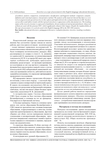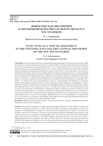В данной статье будет рассмотрена функция оценивания в воспитательном дискурсе (ВД), реализуемая с помощью инвективной лексики. Участники ВД, воспитатель и воспитуемый, различаются по степени презентационной активности в диалоге, и со стороны воспитуемого зачастую не следует вербальной реакции на высказывания педагога, т. е. имеет место речевой акт молчания. Это позволяет определить ВДкак высказывания воспитателя в адрес воспитуемого с целью произвести на него воспитывающее воздействие. Целью данной работы является определение функционального аспекта инвектив в англоязычном воспитательном дискурсе. Объектом исследования является англоязычная инвективная лексика. Предметом -употребление инвективной лексики в функции оценивания в ВД. В качестве материала исследования послужили тексты британской и американской художественной литературы XIX-XXI вв., где даются описания воспитательного процесса и присутствует ВД. Методы исследования включали общенаучные методы синтеза, анализа, сравнения, систематизации, классификации; и лингвистические методы: компонентный, семантический и дефиниционный, контекстуальный анализы, интерпретативный метод. Анализ материала показал, что в ВД присутствует весьма богатый набор общих и специальных инвектив в эксплицитной и имплицитной форме в функции оценивания. Педагоги в речи могут использовать прямые и косвенные оскорбления, содержащие указания на слова, действия или внешность воспитуемого. Оскорбительный характер инвективных лексем выражается в унижении, угрозах физического и психического наказания. Практически все из них употребляются с местоимением you, что значительно усиливает их воздействие. Несмотря на недопустимость подобного вида оценки, она активно используется в англоязычном XIX-XXI вв.
