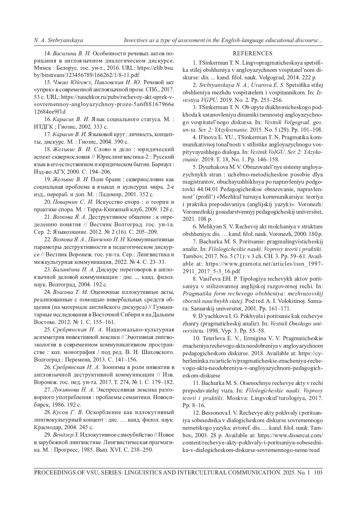 22. Волкова Я. А., Панченко Н. Н. Коммуникативные параметры деструктивности в педагогическом дискурсе // Вестник Воронеж, гос. ун-та. Сер.: Лингвистика и межкультурная коммуникация, 2022. № 4. С. 23-33. EDN: CFMPQC