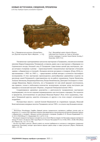 Существовавшие в начале ХХ в. в Талашкине, смоленском имении княгини Марии Тенишевой, столярная и резная мастерские известны своими изделиями среди музейных работников, коллекционеров и любителей русского стиля и 120 лет спустя после их закрытия. В этих мастерских была создана разнообразная мебель и домашняя утварь по рисункам самой Тенишевой и сотрудничавших с ней художников. По эскизам Николая Рериха 1904-1905 гг. были произведены в мастерских всего лишь четыре деревянных предмета: книжный шкаф, стол, кресло и диван. Хранящиеся в российских архивах письма, адресованные Николаем Рерихом Марии Тенишевой, позволяют изложить историю возникновения этих проектов и благодаря уцелевшим фотографиям рассмотреть изготовленные в мастерских предметы. Приводимые в статье сведения доказывают, что шкатулка «Остров Буян», которой в выставочном и аукционном каталогах необоснованно приписано авторство Николая Рериха и место изготовления - талашкинские мастерские, является подделанным объектом.