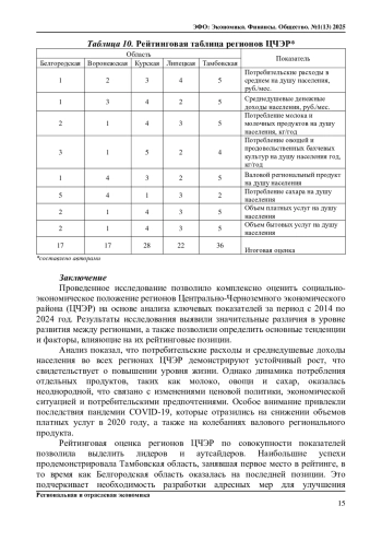 В данной статье представлена методика рейтинговой оценки социальноэкономического положения регионов Центрально-Черноземного экономического района (ЦЧЭР). Предложенная методика основана на комплексном анализе ключевых показателей, характеризующих экономическую активность, социальную сферу и экологическую устойчивость каждого региона. Целью исследования является выявление лидеров и аутсайдеров в социально-экономическом развитии внутри ЦЧЭР, а также определение факторов, оказывающих наибольшее влияние на формирование рейтинговых позиций. Результаты рейтинговой оценки позволяют оценить эффективность региональной политики, выявить проблемные зоны и разработать рекомендации по улучшению социально-экономического положения регионов ЦЧЭР. Статья представляет интерес для специалистов в области региональной экономики, государственного управления и стратегического планирования.