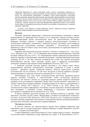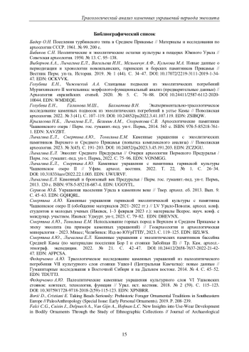 14. Смертина А.Ю., Лычагина Е.Л. Каменные украшения с энеолитических памятников бассейна Средней Камы (по материалам поселения Бор I и стоянки Забойная II) // Тр. Кам. археол.-этнограф. экспедиции. 2022. № 21. С. 42-47. DOI: 10.24412/2658-7637-2022-21-42-47 EDN: AFPCSA