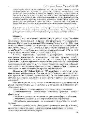 В статье исследуются актуальные аспекты онлайн-образования в условиях цифровой трансформации образовательного процесса. Основная цель работы – проведение комплексного анализа возможностей и рисков онлайн-обучения для разработки рекомендаций по повышению его эффективности. Рассматриваются технические, методические и психологические особенности дистанционного формата обучения. На основе системного подхода и статистического анализа данных 2022-2024 годов выявлены ключевые тенденции развития онлайн-образования, определены основные преимущества и проблемные зоны. В работе представлены практические рекомендации по совершенствованию технологической инфраструктуры, методического обеспечения и психолого-педагогической поддержки обучающихся. Сделаны выводы о перспективах развития онлайн-образования и необходимых мерах по повышению его качества.