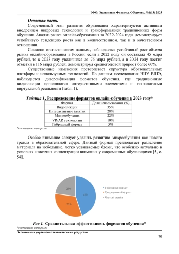 Актуальность исследования возможностей и рисков онлайн-обучения обусловлена стремительной цифровой трансформацией образовательного процесса. По данным исследования EdTech-рынка России, к началу 2024 года более 85% образовательных учреждений внедрили элементы онлайн-обучения в свои программы [3, с. 156]. Глобальный рынок онлайн-образования, согласно отчету World Economic Forum, демонстрирует ежегодный рост на 16,5%, и к 2025 году его объем достигнет 350 млрд долларов [9, с. 125].