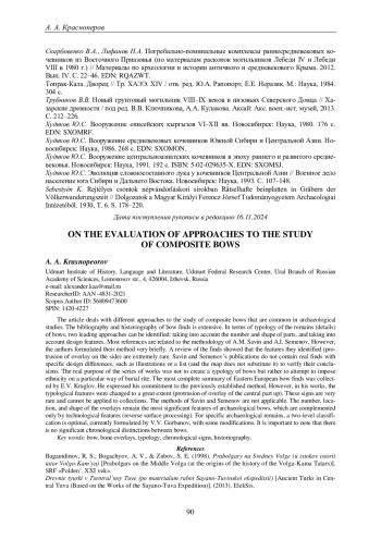 Одним из актуальных вопросов в археологии Волго-Уралья является хронология. Однако некоторые категории находок, периоды и территории практически выпали из обсуждения. Одной из таких проблемных групп являются сложносоставные луки. Интерес автора был обусловлен обсуждением конкретных находок с Бирского могильника в контексте появления и распространения деталей такого вида вооружения в Прикамье (этому был посвящен доклад на I Мажитовских чтениях в декабре 2018 г.), а одной из трудностей оказалось типологическое определение археологически сохраняющихся элементов – распространенные в литературе теоретические подходы плохо соотносятся с реальным материалом, что и побудило обратить внимание на историографию и имеющиеся подходы к изучению.