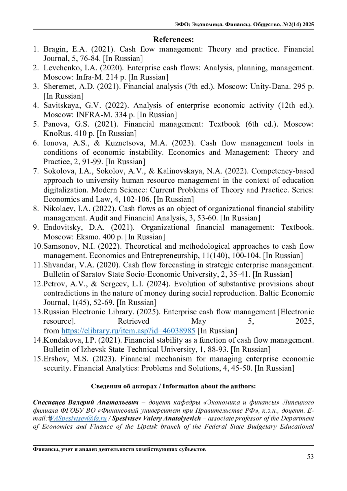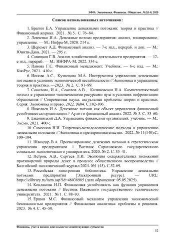 1. Брагин Е.А. Управление денежными потоками: теория и практика // Финансовый журнал. 2021. № 5. С. 76-84.