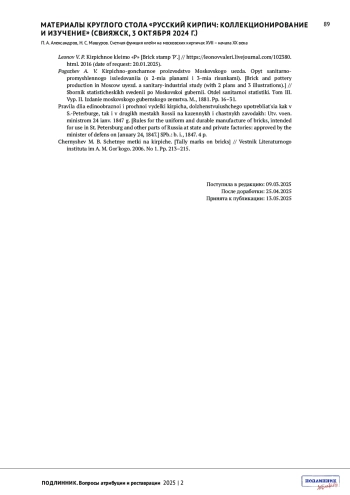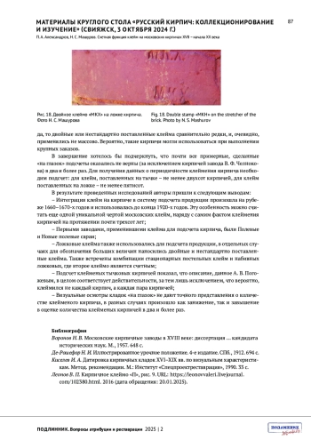 Процесс подсчета готовой продукции путем постановки на кирпичи клейм и счетных меток на московских кирпичных заводах второй половины XIX века подробно описан в очерке «Кирпично-гончарное производство Московского уезда» А. В. Погожева, опубликованном в 1881 году. Из описания следует, что, в отличии от других регионов страны, где для подсчета применялась система постановки знаков в виде точек и резцов на кирпиче-сырце, в Москве применялись в том числе и клейма. В данном исследовании впервые приведены результаты прямых подсчетов периодичности клеймения кирпичей, произведенных с конца XVIII до начала XX века, что дает четкое представление о системе, действовавшей на московских заводах. Авторами сделаны выводы о временном интервале использования клейм для подсчета готовой продукции, и заводах, на которых данная практика была применена впервые. Экспериментальным способом частично подтверждены данные, приведенные в работе А. В. Погожева.