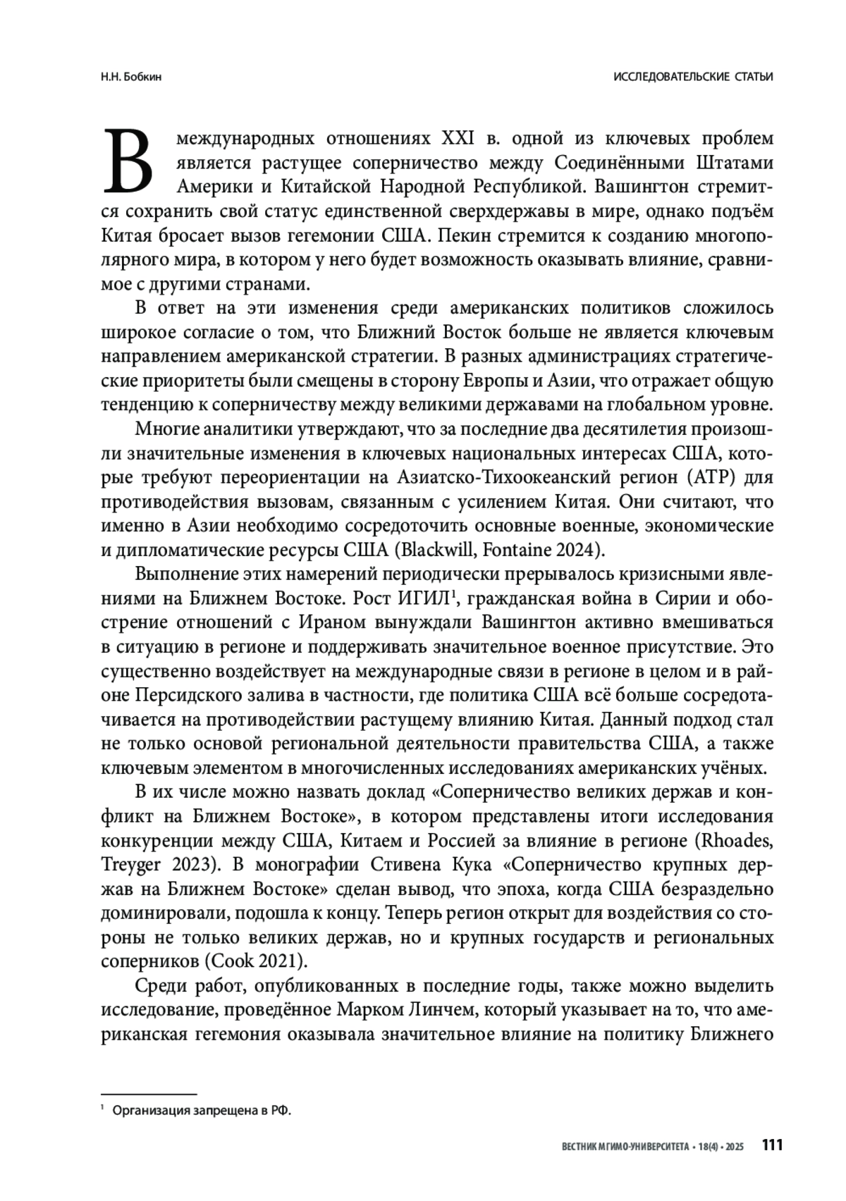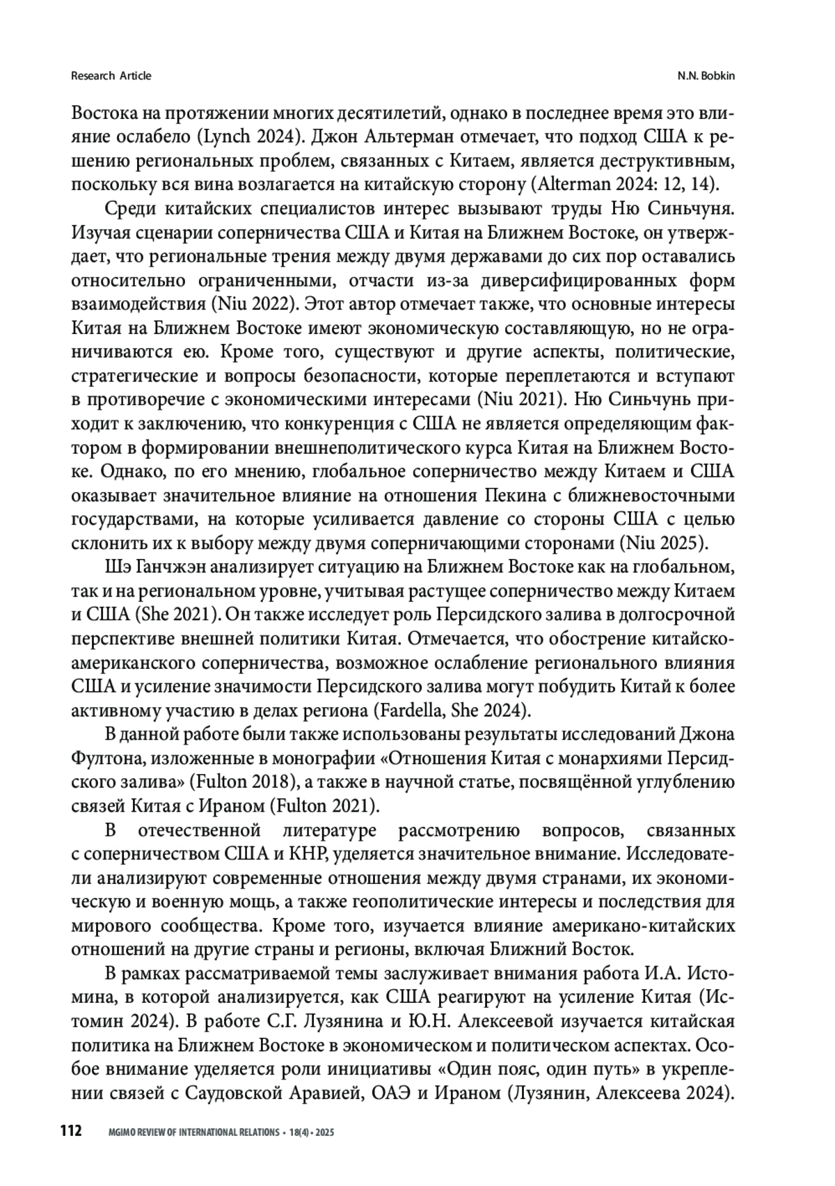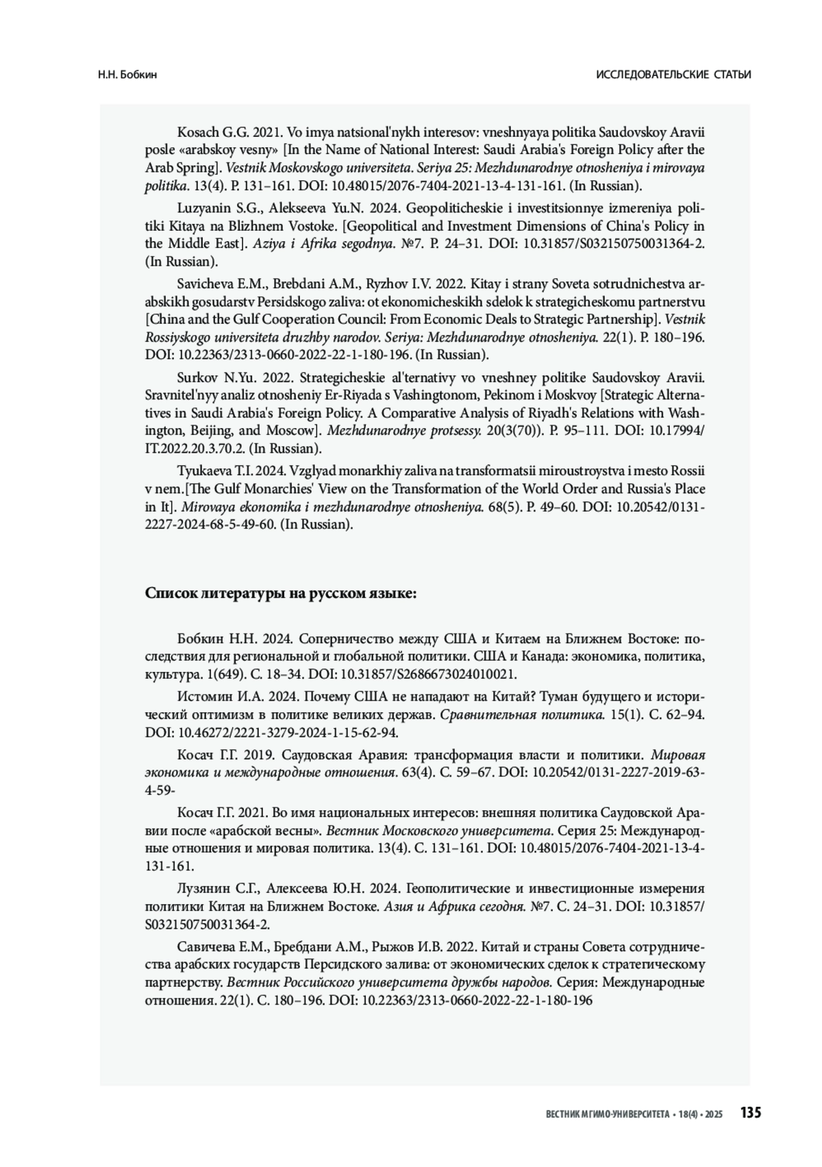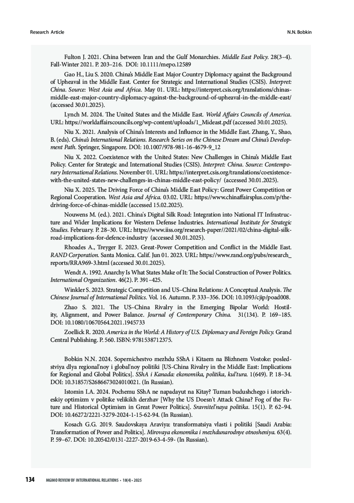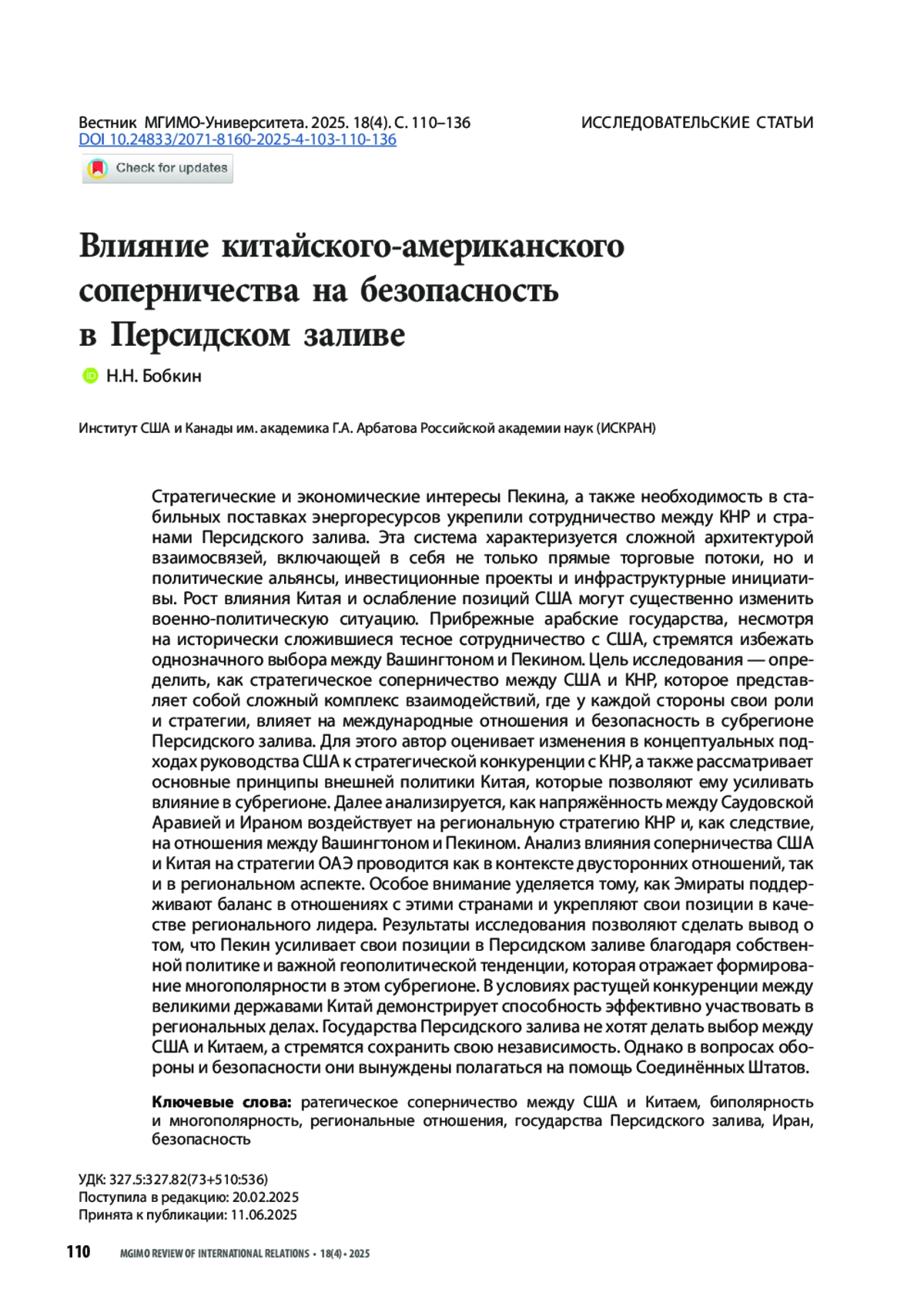 БОБКИН Н. Н. ВЛИЯНИЕ КИТАЙСКОГО-АМЕРИКАНСКОГО СОПЕРНИЧЕСТВА НА БЕЗОПАСНОСТЬ В ПЕРСИДСКОМ ЗАЛИВЕ // ВЕСТНИК МГИМО-УНИВЕРСИТЕТА. 2025. ТОМ 18, № 4