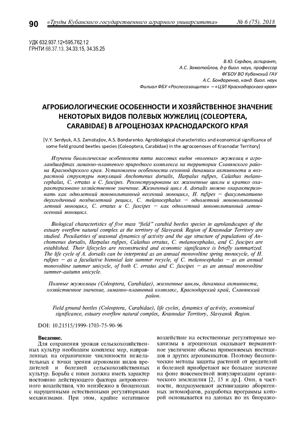 СЕРДЮК В. Ю., ЗАМОТАЙЛОВ А. С., БОНДАРЕНКО А. С. АГРОБИОЛОГИЧЕСКИЕ ОСОБЕННОСТИ И ХОЗЯЙСТВЕННОЕ ЗНАЧЕНИЕ НЕКОТОРЫХ ВИДОВ ПОЛЕВЫХ ЖУЖЕЛИЦ (COLEOPTERA, CARABIDAE) В АГРОЦЕНОЗАХ КРАСНОДАРСКОГО КРАЯ