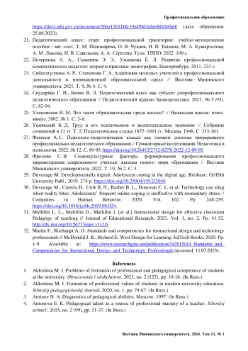 1. Алдошина М. И. Проблемы формирования профессионально-педагогической компетентности студентов в университете // Образование и общество. 2021. № 2 (127). С. 10-16.