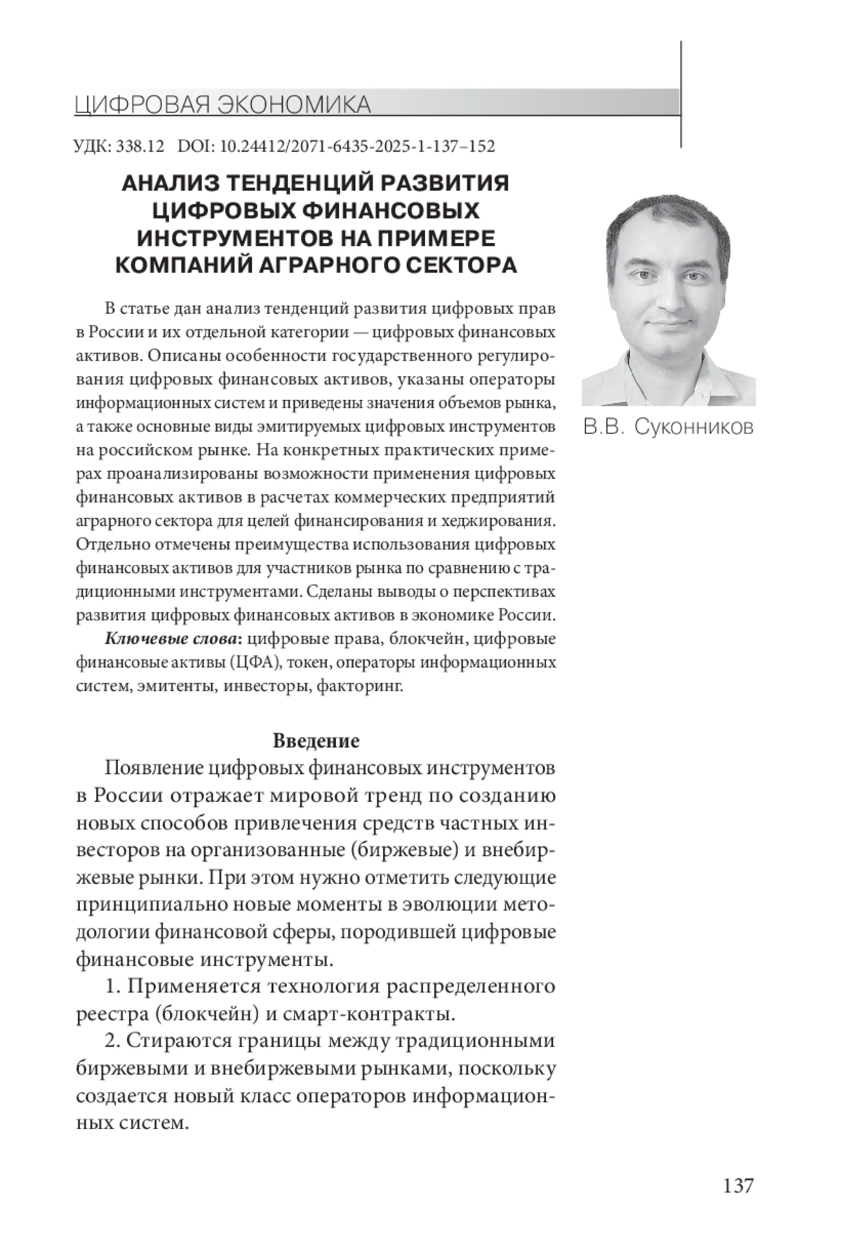 6. Лансков П. М. Цифровые финансовые активы, их происхождение, развитие и перспективы на российском финансовом рынке / П. М. Лансков, М. В. Мурашов, Д. П. Лансков. Москва: ООО “Издательство МАГИСТР”, 2021. 28 с. DOI: 10.12737/1859925