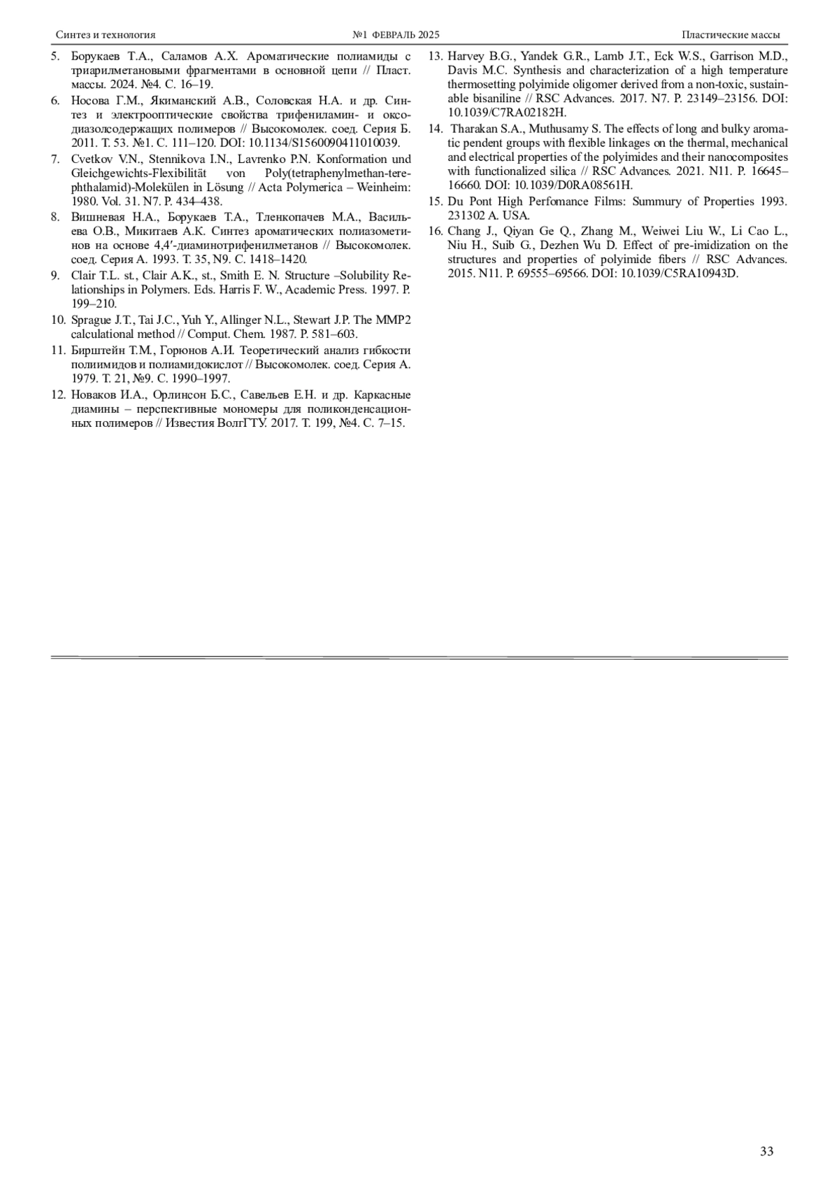 13. Harvey B.G., Yandek G.R., Lamb J.T., Eck W.S., Garrison M.D., Davis M.C. Synthesis and characterization of a high temperature thermosetting polyimide oligomer derived from a non-toxic, sustainable bisaniline // RSC Advances. 2017. N7. P. 23149-23156. DOI: 10.1039/С7RA02182H.