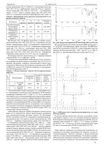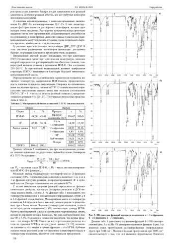 Переработка накапливающихся отходов ПЭТ (ПЭТ-О) считается экономически эффективной разработкой, становится важной глобальной проблемой и соответствует принципам устойчивого развития. Определены физико-химические свойс тва вторичного полиэтилентерефталата, оценены структура, фазовый состав полимера. Результаты этих исследований позволили заключить, что ПЭТ в процессе переработки, эксплуатации в виде баклажек и хранения существенно не теряет в свойствах. Исключением является значение молекулярной массы, которая снижается до 19900, по-видимому, вследствие гидролитической деструкции. Анализ литературных данных выявил условия проведения гликолиза отходов полиэтилентерефталата. При определенных условиях проведен гликолиз ПЭТ-О, составлен материальный баланс процесса, по результатам которого рассчитаны степень конверсии ПЭТ-О и выход основного продукта гликолиза (88%). Продукт гликолиза фракционирован, определены физико-химические свойства каждой фракции. Показано, что основными про-дуктами гликолиза являются бис(гидроксиэтил)терефталат и его димер. Данное предположение подтверждено ИК- и ПМР-спектроскопическими исследованиями, ДСК анализом и встречным синтезом.