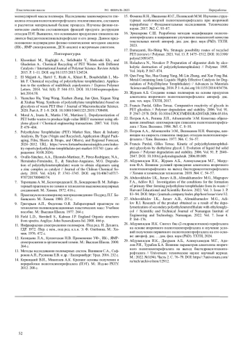 1. Khoonkari M., Haghighi A., Sefi dbakht Y., Shekoohi Kh., and Ghaderian A.. Chemical Recycling of PET Wastes with Different Catalysts // International Journal of Polymer Science. Review Article 2015. Р. 1-11. DOI: 10.1155/2015/124524