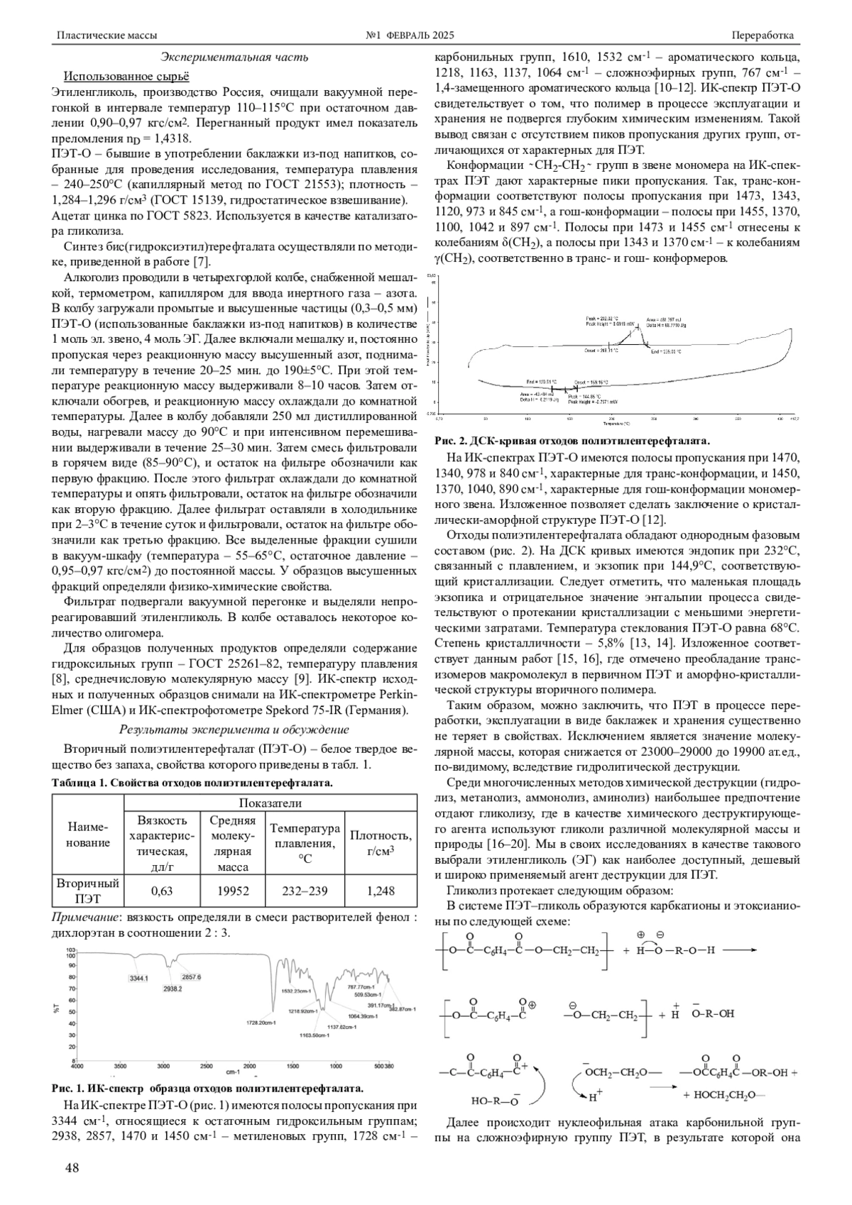 25. Абдувохидов И.К., Жураев А.Б., Алимухамедов М.Г., Магрупов Ф.А. Влияние условий проведения алкоголиза вторичного полиэтилентерефталата на выход бисгидроксиэтилтерефталата // Химия и химическая технология. 2019. №4. С. 54-57.