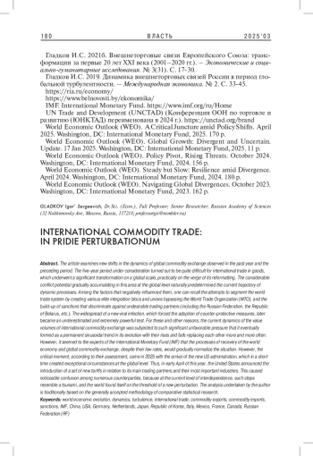 2. Гладков И.С. 2024а. Мирохозяйственная эволюция и международная торговля: тренды 2023. - Власть. Т. 32. № 4. С. 187-192. EDN: NPFRVR