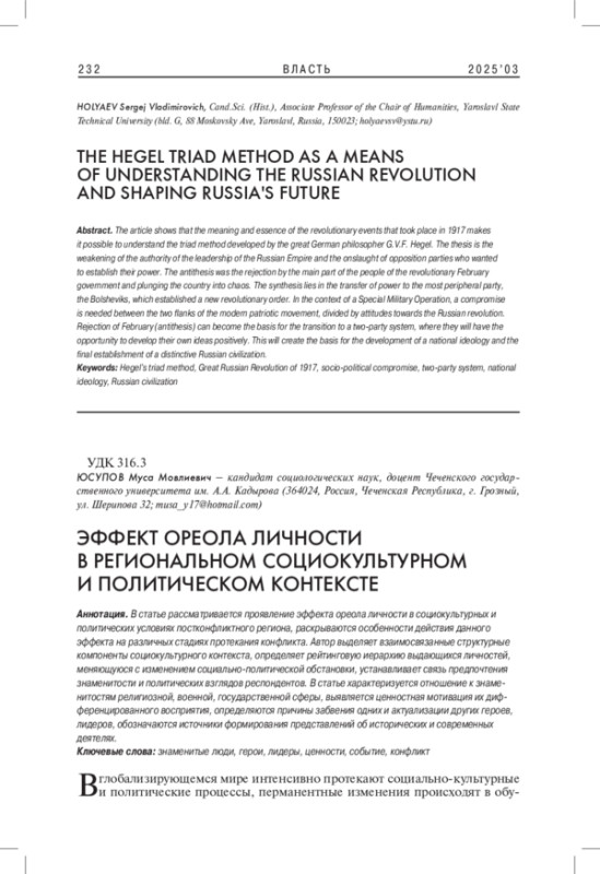 В статье рассматривается проявление эффекта ореола личности в социокультурных и политических условиях постконфликтного региона, раскрываются особенности действия данного эффекта на различных стадиях протекания конфликта. Автор выделяет взаимосвязанные структурные компоненты социокультурного контекста, определяет рейтинговую иерархию выдающихся личностей, меняющуюся с изменением социально-политической обстановки, устанавливает связь предпочтения знаменитости и политических взглядов респондентов. В статье характеризуется отношение к знаменитостям религиозной, военной, государственной сферы, выявляется ценностная мотивация их дифференцированного восприятия, определяются причины забвения одних и актуализации других героев, лидеров, обозначаются источники формирования представлений об исторических и современных деятелях.