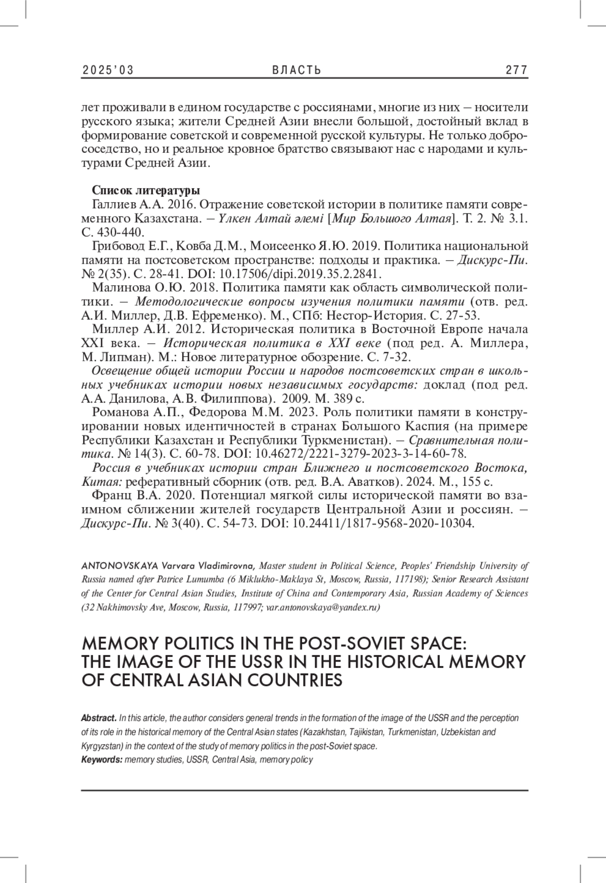 В статье рассматриваются общие тренды формирования образа СССР и восприятие его роли в исторической памяти государств Центрально-Азиатского региона (Казахстан, Таджикистан, Туркменистан, Узбекистан и Кыргызстан) в контексте исследования политики памяти на постсоветском пространстве.