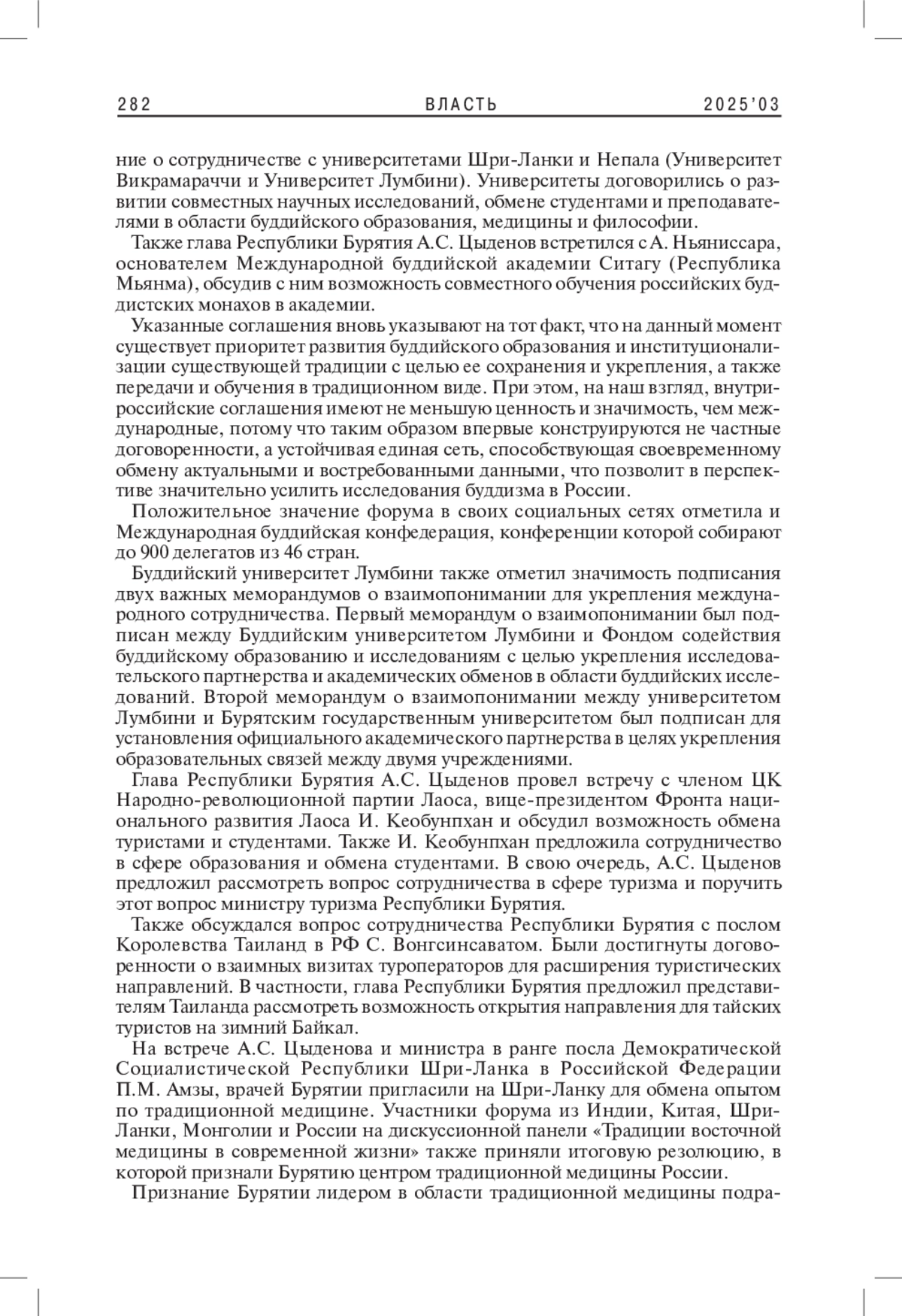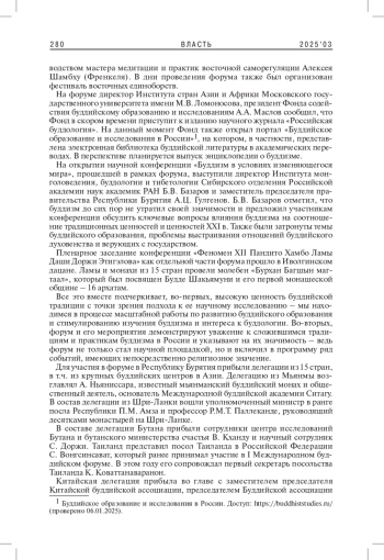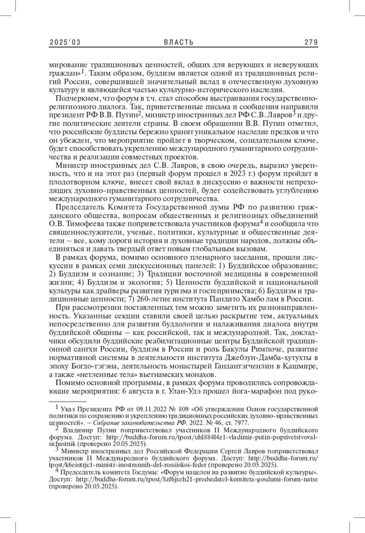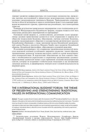 ДАВЛЕТШИНА Д. А., СУКИАСЯНЦ Н. Н. II МЕЖДУНАРОДНЫЙ БУДДИЙСКИЙ ФОРУМ: ТЕМА СОХРАНЕНИЯ И УКРЕПЛЕНИЯ ТРАДИЦИОННЫХ ЦЕННОСТЕЙ В МЕЖДУНАРОДНОЙ КОММУНИКАЦИИ // ВЛАСТЬ. 2025. ТОМ 33 № 3