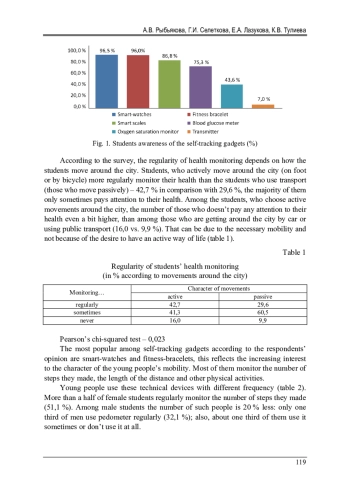 Статья базируется на результатах социологического исследования студенческой молодежи в городе-миллионере и раскрывает специфику социологического исследования селф-трекинга, связанную прежде всего с изучением отношений между врачом, рекомендующим селф-трекинг, и пациентом, использующим его, а также с компаративным анализом различных социальных групп, являющихся потребителем данной технологии. Статья посвящена особенностям самомониторинга молодежи с помощью цифровых устройств, которые раскрываются на основе эмпирического исследования, проведенного авторами в 2023 г. среди студентов вузов г. Перми. В качестве методологии исследования выбрана теория мобильности Дж. Урри. Одной из задач исследования был поиск ответа на вопрос: является ли селф-трекинг для молодого поколения средством диагностики состояния своего здоровья («селф-трекинг для себя»), или потребление трекинг-гаджетов в современных условиях становится показателем определенного социального статуса («селф-трекинг для других»)? Авторы склоняются к первому тезису. В результате исследования была сконструирована собственная типология студентов по селф-трекингу: «зависимые», «независимые», «самодостаточные» и «умеренные», выявлена распространенность представленных типов. Доминирующим становится достаточно благоприятный тип «независимые», характеризующийся отсутствием болезненной привязанности к трекинг-гаджетам и не нацеленный на публичное представление в социальных сетях своих зафиксированных данных. Согласно результатам исследования, на регулярность отслеживания состояния своего здоровья влияет характер перемещений студентов по городу. Были выявлены наиболее распространенные устройства для трекинга среди городской молодежи. Из широкого перечня таких устройств студентам известны в основном фитнес-браслеты, смарт-часы, что также отражает повышенный интерес к характеру мобильности молодежи.