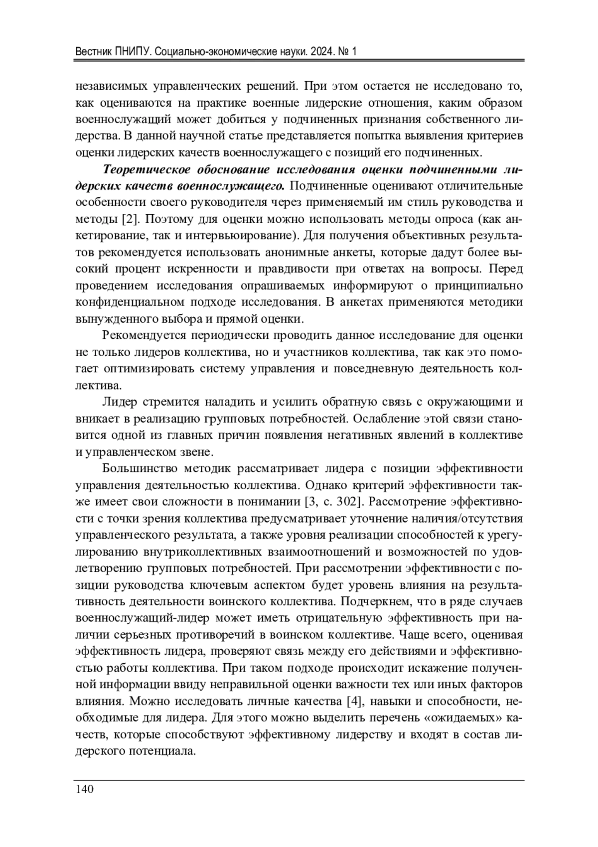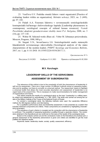 Актуальность данной статьи обусловлена сложностью как самого феномена лидерства, так и его оценки. Существует огромное количество различных методик, направленных на оценку лидерства и его качеств, но универсальной методики на данный момент нет. Стремление исследователей выделить универсальный инструментарий, позволяющий наиболее точно раскрыть и оценить лидерство, является актуальной задачей и в настоящее время. Это необходимо для выработки рекомендаций по более эффективному управлению и руководству организациями и коллективами. В настоящей статье представлены результаты социологического исследования на тему «Лидерство в воинском коллективе, его критерии и оценка подчиненными» ( n = 300, 2023 г.). Данное исследования проведено среди курсантов военного института войск национальной гвардии России. Для проведения социологического исследования применялись следующие методики: методика «Эффективность лидерства», метод оценки «360 градусов» и интервьюирование. Для качественного исследования эффективности и оценки лидерства оно было представлено в виде системы, включающей в себя отдельные компоненты и критерии. Эти компоненты рассмотрены посредством выделения характеризующих показателей. Раскрывается содержание каждого критерия и подтверждается его связь с феноменом лидерства. Обосновывается возможность оценки лидерства через отдельно выделенный критерий. Подтверждаются выводы, полученные в теоретической части на основе результатов проведенного социологического исследования. На основании проведенного анализа и полученных выводов по теоретической и практической части дается общая оценка феномену лидерства и выделяются критерии, позволяющие получить наиболее обоснованные и объективные результаты.